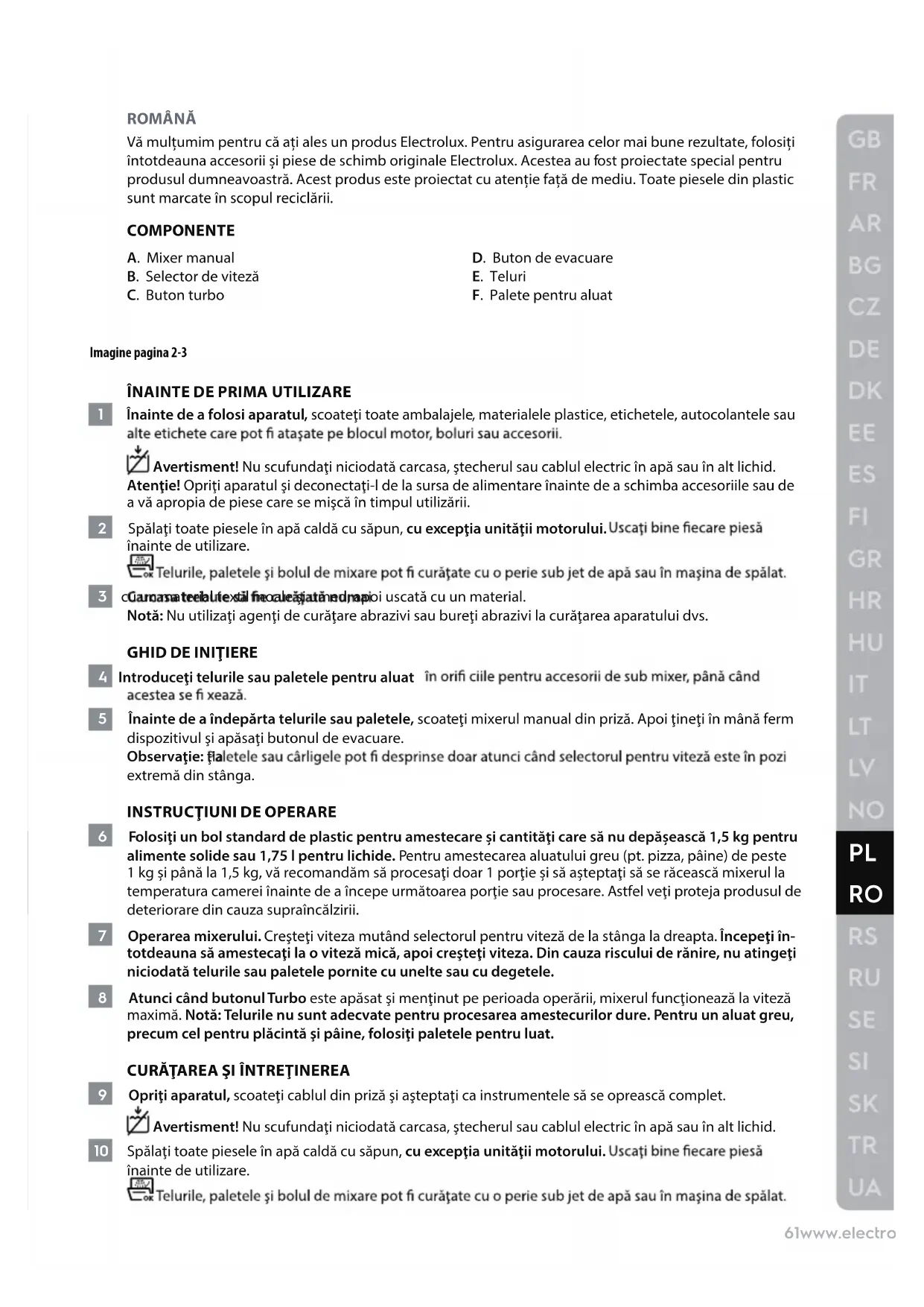 ROMÂNĂ Vă mulțumim pentru că ați ales un produs Electrolux. Pentru asigurarea celor mai bune rezultate, folosiți întotdeauna accesorii și piese de schimb originale Electrolux. Acestea au fost proiectate special pentru produsul dumneavoastră. Acest produs este proiectat cu atenție față de mediu. Toate piesele din plastic sunt marcate în scopul reciclării. COMPONENTE A. Mixer manual B. Selector de viteză C. Buton turbo D. Buton de evacuare E. Teluri F. Palete pentru aluat Imagine pagina 2-3