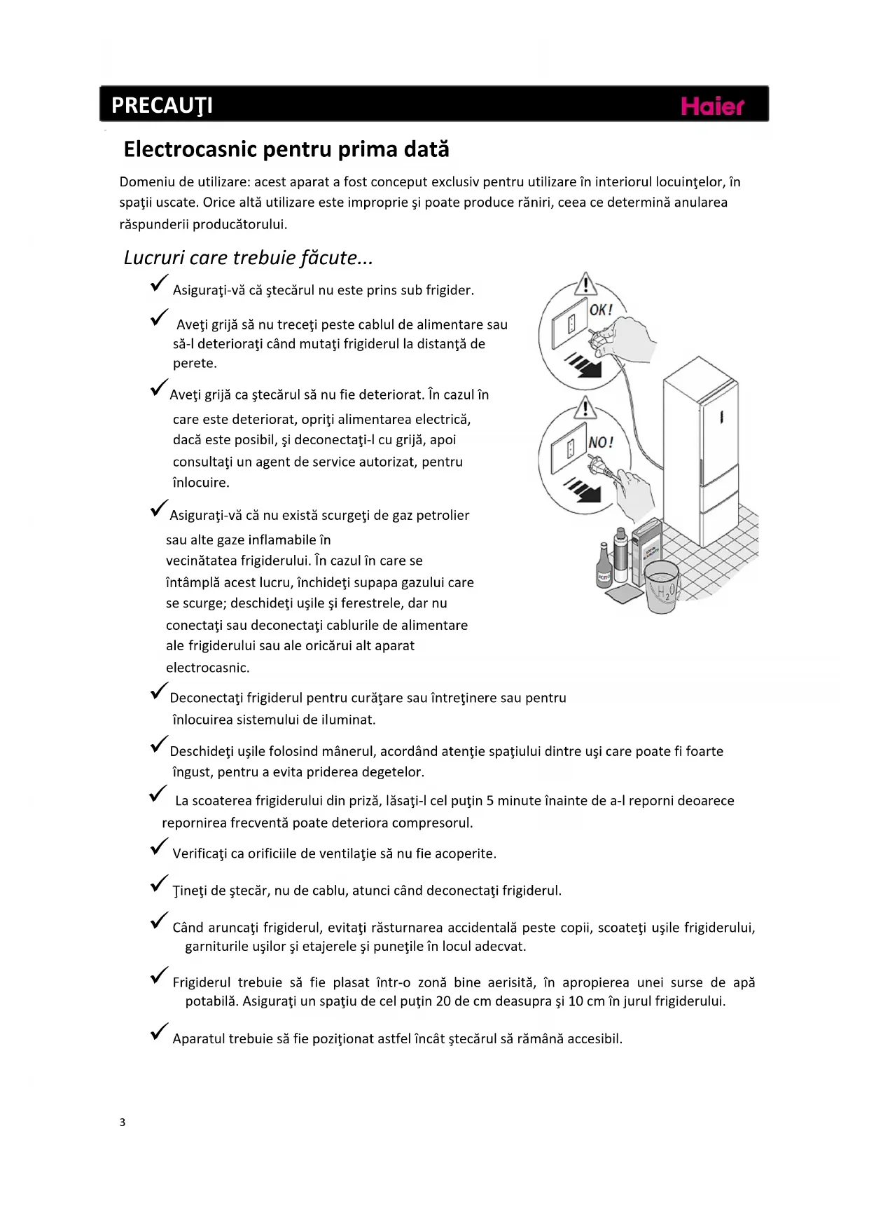 Electrocasnicpentruprimadată Domeniudeutilizare:acestaparatafostconceputexclusivpentruutilizareîn interiorullocuinţelor,în spaţiiuscate.Oricealtăutilizareesteimproprieşipoateproducerăniri,ceeacedeterminăanularea răspunderiiproducătorului. Lucruricaretrebuiefăcute... 9 Asiguraţi‐văcăştecărulnuestepri nssubfrigider. 9 Aveţigrijăsănutreceţipestecabluldealimentar esau să‐ldeterioraţicândmutaţifrigiderulladistanţăde perete. 9Aveţigrijăcaştecărulsănufiedeteriorat.Încazulîn careestedeteriorat,opriţialimentareaelectrică, dacăesteposibil,şideconectaţi‐lcugrijă,apoi consultaţiunagentdeserviceautorizat,pentru înlocuire. 9Asiguraţi‐văcănuexistăscurgeţidegazpetrolier saualtegazeinflamabileîn vecinătateafrigiderului.Încazulîncarese întâmplăacestlucru,închideţisupapagazuluicare sescurge;deschideţiuşileşiferestrele,darnu conectaţisaudeconectaţicabluriledealimentare ale frigideruluisaualeoricăruialtaparat electrocasnic. 9Deconectaţifrigiderulpentrucurăţaresauîntreţineresaupentru înlocuireasistemuluideiluminat. 9Deschideţiuşilefolosindmânerul,acordândatenţiespaţiuluidintreuşicarepoatefifoarte îngust,pentruaevitapridereadegetelor. 9 Lascoatereafrigideruluidinpriză,lăsaţi‐lcelpuţin5minuteînaintedea‐lrepornideoarece repornireafrecventăpoatedeterioracompresorul. 9 Verificaţicaorificiiledeventilaţiesănufieacoperite. 9 Ţineţideştecăr,nudecablu,atuncicânddeconectaţifrigiderul. 9 Cândaruncaţifrigiderul,evitaţirăsturnareaaccidentalăpestecopii,scoateţiuşilefrigiderului, garniturileuşilorşietajereleşipuneţileînloculadecvat. 9 Frigiderul trebuie să fie plasat într‐o zonă bine aerisită, în apropierea unei surse de apă potabilă.Asiguraţiunspaţiudecelpuţin20decmdeasupraşi10cmînjurulfrigiderului. 9 Aparatultrebuiesăfiepoziţionatastfelîncâtştecărulsărămânăaccesibil.