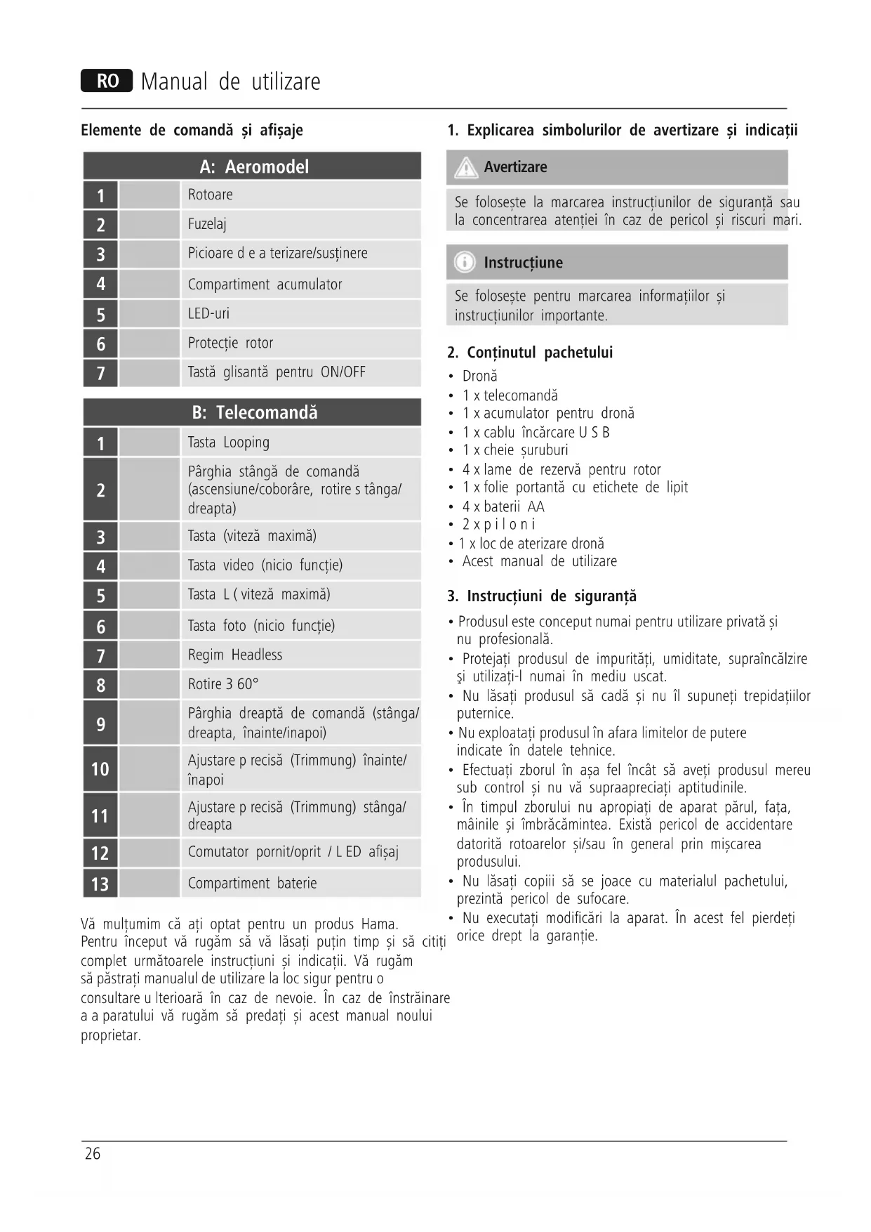 - Durata efectivă de zbor variază în funcție de folosirea, reglările produsului și condițiile mediului înconjurător (de ex. temperaturile sub 5°C și peste 25°C scad capacitatea acumulatorului).