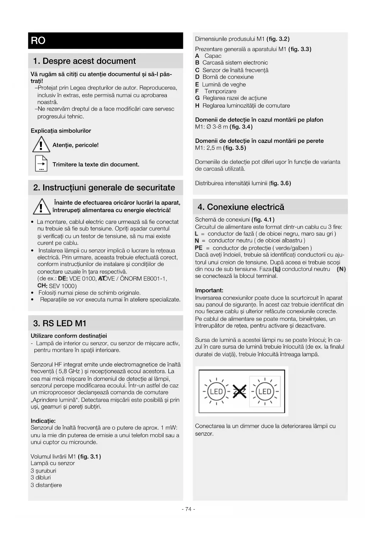 Utilizare conform destinaţiei - Lampă de interior cu senzor, cu senzor de mișcare activ, pentru montare în spaţii interioare. Senzorul HF integrat emite unde electromagnetice de înaltă frecvenţă ( 5,8 GHz ) și recepţionează ecoul acestora. La cea mai mică mișcare în domeniul de detecţie al lămpii, senzorul percepe modificarea ecoului. Într-un astfel de caz un microprocesor declanșează comanda de comutare „Aprindere lumină“. Detectarea mișcării este posibilă și prin uși, geamuri și pereţi subţiri. Indicaţie: Senzorul de înaltă frecvenţă are o putere de aprox. 1 mW: unu la mie din puterea de emisie a unui telefon mobil sau a unui cuptor cu microunde. Volumul livrării M1 ( fig.3.1 ) Lampă cu senzor 3 șuruburi 3 dibluri 3 distanţiere !- 75 -
