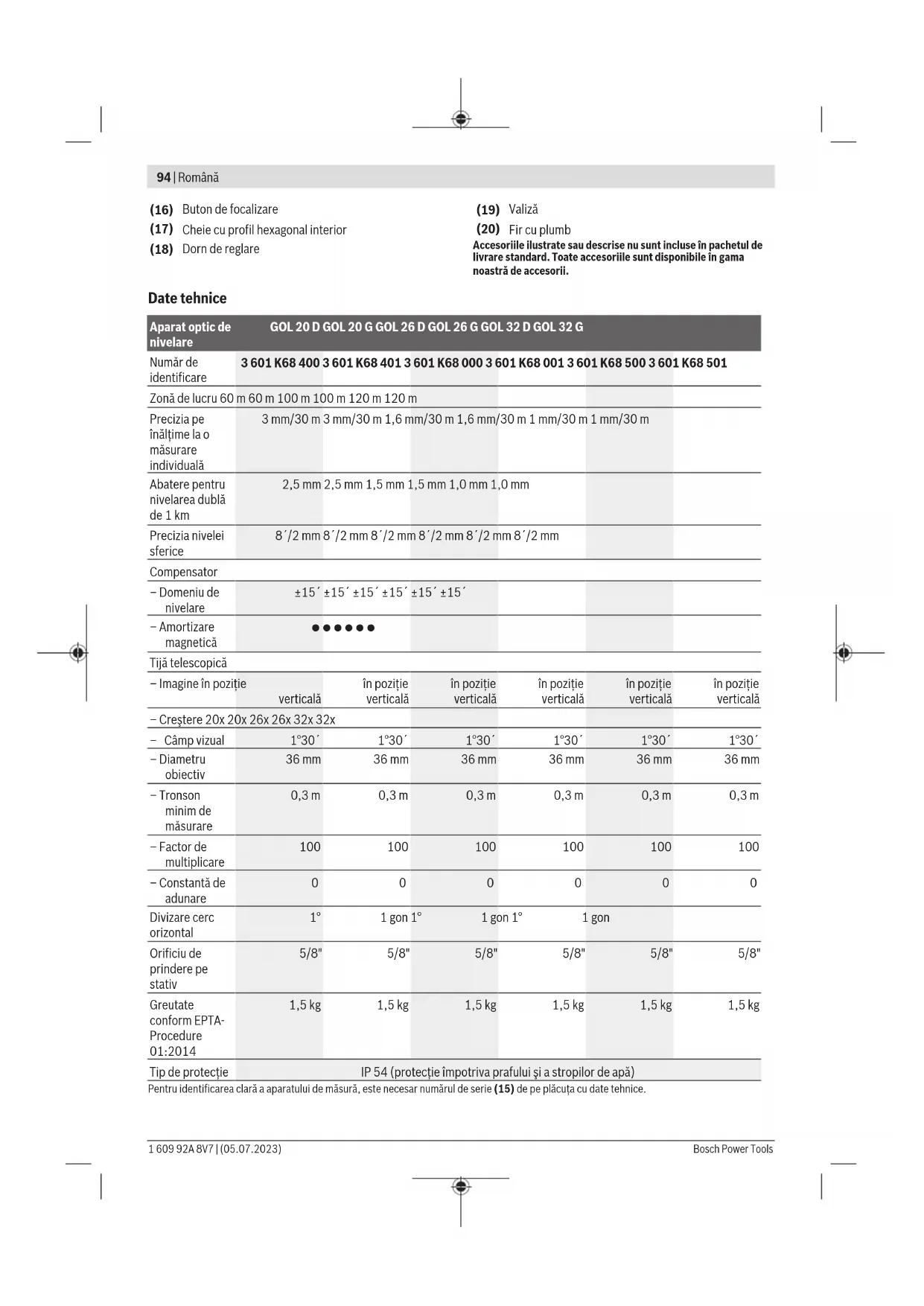 Қате жолмен кәдеге жаратылған ескі электрлік және электрондық құрылғылар қауіпті заттардың болу мүмкіндігіне байланысты қоршаған ортаға және адам денсаулығына зиянды әсер тигізуі мүмкін. Română Instrucţiuni de siguranţă Citiţi şi respectaţi toate instrucţiunile pentru a putea nepericulos şi sigur cu aparatul de măsură. Dacă aparatul de măsură nu este folosit conform prezentelor instrucţiuni, dispozitivele de protecţie integrate în acesta pot fi afectate. Nu deterioraţi niciodată indicatoarele de avertizare de pe aparatul dumneavoastră de măsură, făcându-le nelizibile. PĂSTRAŢI ÎN CONDIŢII OPLTIME PREZENTELE INSTRUCŢIUNI ŞI TRANSMITEŢI-LE MAI DEPARTE LA PREDAREA APARATULUI DE MĂSURĂ. u Nu permiteţi repararea aparatului de măsură decât de către personal de specialitate corespunzător calificat şi numai cu piese de schimb originale. Numai în acest mod poate fi garantată siguranţa de exploatare a aparatului de măsură. Descrierea produsului şi a performanțelor sale Ţineţi cont de ilustraţiile din secţiunea anterioară a instrucţiunilor de utilizare. Utilizarea conform destinaţiei Aparatul de măsură este destinat determinării şi verificării gradienţilor de înălţime perfect orizontali. Acesta este, de asemenea, adecvat pentru măsurarea înălţimilor, distanţelor şi unghiurilor. Componentele ilustrate Numerotarea componentelor ilustrate se referă la schiţa aparatului de măsură de la pagina grafică. (1) Obiectiv (2) Vizor grosier (3) Oglinda nivelei (4) Protecţie oculară (5) Şurub de reglare a liniei de vizibilitate (6) Ocular (7) Nivelă sferică (8) Buton de blocare a compensatorului (9) Marcaj de citire de pe cercul orizontal (10) Cerc orizontal (11) Şurub de reglare a nivelei sferice (12) Şurub de reglare a piciorului (13) Orificiu de 5/8" de prindere pe stativ (pe partea inferioară) (14) Mecanism lateral de reglare precisă (15) Număr de serie Bosch Power Tools 1 609 92A 8V7 | (05.07.2023)94 | Română (16) Buton de focalizare (17) Cheie cu profil hexagonal interior (18) Dorn de reglare (19) Valiză (20) Fir cu plumb Accesoriile ilustrate sau descrise nu sunt incluse în pachetul de livrare standard. Toate accesoriile sunt disponibile în gama noastră de accesorii. Date tehnice Aparat optic de nivelare GOL 20 D GOL 20 G GOL 26 D GOL 26 G GOL 32 D GOL 32 G Număr de identificare 3601K68400 3601K68401 3601K68000 3601K68001 3601K68500 3601K68501 Zonă de lucru 60m 60m 100m 100m 120m 120m Precizia pe înălţime la o măsurare individuală 3mm/30m 3mm/30m 1,6mm/30m 1,6mm/30m 1mm/30m 1mm/30m Abatere pentru nivelarea dublă de 1km 2,5mm 2,5mm 1,5mm 1,5mm 1,0mm 1,0mm Precizia nivelei sferice 8´/2mm 8´/2mm 8´/2mm 8´/2mm 8´/2mm 8´/2mm Compensator – Domeniu de nivelare ±15´ ±15´ ±15´ ±15´ ±15´ ±15´ – Amortizare magnetică ● ● ● ● ● ● Tijă telescopică – Imagine în poziţie verticală în poziţie verticală în poziţie verticală în poziţie verticală în poziţie verticală în poziţie verticală – Creştere 20x 20x 26x 26x 32x 32x – Câmp vizual 1°30´ 1°30´ 1°30´ 1°30´ 1°30´ 1°30´ – Diametru obiectiv 36mm 36mm 36mm 36mm 36mm 36mm – Tronson minim de măsurare 0,3m 0,3m 0,3m 0,3m 0,3m 0,3m – Factor de multiplicare