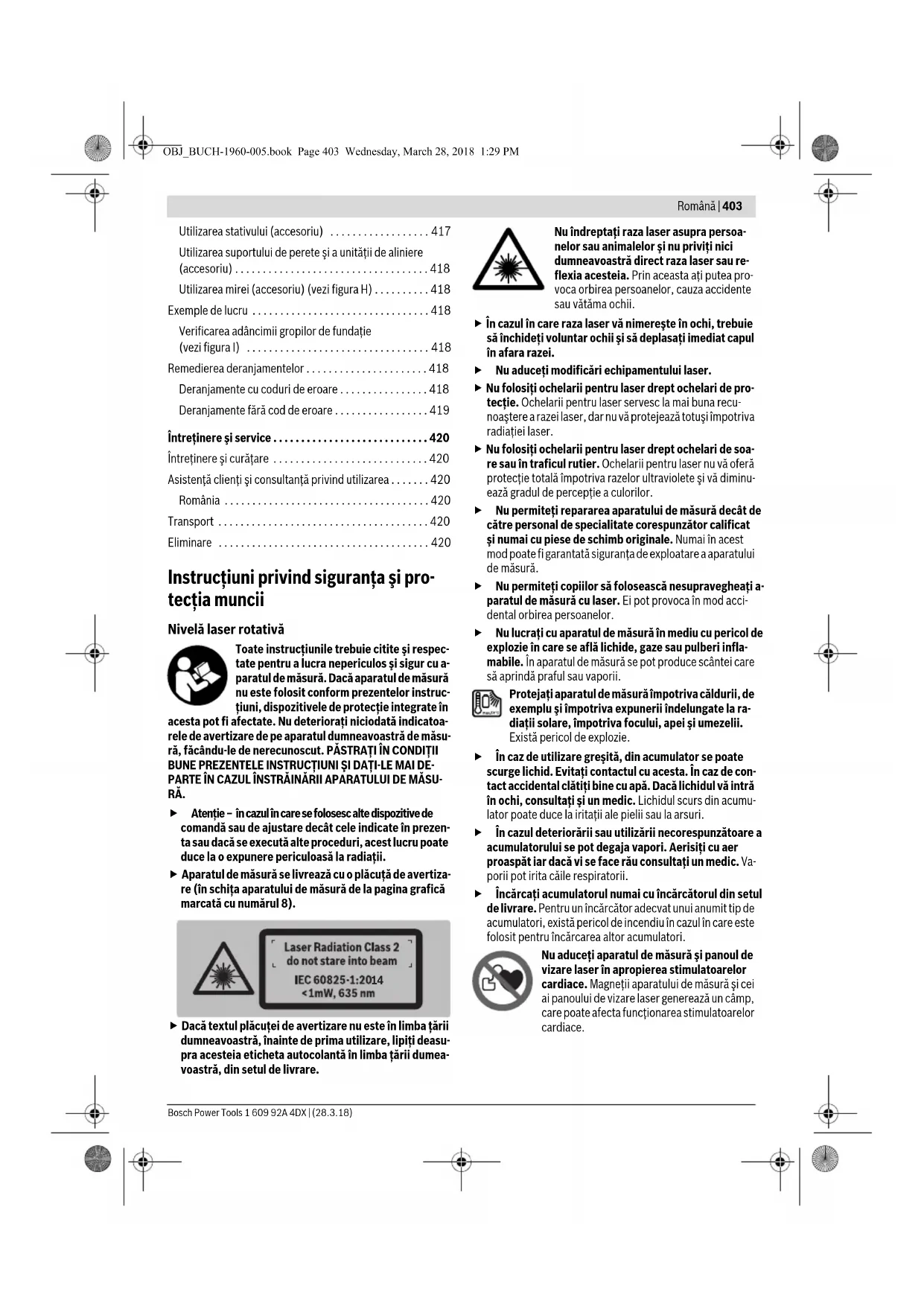 - Eliminare Instrucţiuni privind siguranţa şi pro- tecţia muncii Nivelă laser rotativă Toate instrucţiunile trebuie citite şi respec- tate pentru a lucra nepericulos şi sigur cu a- paratul de măsură. Dacă aparatul de măsură nu este folosit conform prezentelor instruc- ţiuni, dispozitivele de protecţie integrate în acesta pot fi afectate. Nu deterioraţi niciodată indicatoa- rele de avertizare de pe aparatul dumneavoastră de măsu- ră, făcându-le de nerecunoscut. PĂSTRAŢI ÎN CONDIŢII BUNE PREZENTELE INSTRUCŢIUNI ŞI DAŢI-LE MAI DE- PARTE ÎN CAZUL ÎNSTRĂINĂRII APARATULUI DE MĂSU- RĂ. Atenţie – în cazul în care se folosesc alte dispozitive de comandă sau de ajustare decât cele indicate în prezen- ta sau dacă se execută alte proceduri, acest lucru poate duce la o expunere periculoasă la radiaţii. Aparatul de măsură se livrează cu o plăcuţă de avertiza- re (în schiţa aparatului de măsură de la pagina grafică marcată cu numărul 8). Dacă textul plăcuţei de avertizare nu este în limba ţării dumneavoastră, înainte de prima utilizare, lipiţi deasu- pra acesteia eticheta autocolantă în limba ţării dumea- voastră, din setul de livrare. Nu îndreptaţi raza laser asupra persoa- nelor sau animalelor şi nu priviţi nici dumneavoastră direct raza laser sau re- flexia acesteia. Prin aceasta aţi putea pro- voca orbirea persoanelor, cauza accidente sau vătăma ochii. În cazul în care raza laser vă nimereşte în ochi, trebuie să închideţi voluntar ochii şi să deplasaţi imediat capul în afara razei. Nu aduceţi modificări echipamentului laser. Nu folosiţi ochelarii pentru laser drept ochelari de pro- tecţie. Ochelarii pentru laser servesc la mai buna recu- noaştere a razei laser, dar nu vă protejează totuşi împotriva radiaţiei laser. Nu folosiţi ochelarii pentru laser drept ochelari de soa- re sau în traficul rutier. Ochelarii pentru laser nu vă oferă protecţie totală împotriva razelor ultraviolete şi vă diminu- ează gradul de percepţie a culorilor. Nu permiteţi repararea aparatului de măsură decât de către personal de specialitate corespunzător calificat şi numai cu piese de schimb originale. Numai în acest mod poate fi garantată siguranţa de exploatare a aparatului de măsură. Nu permiteţi copiilor să folosească nesupravegheaţi a- paratul de măsură cu laser. Ei pot provoca în mod acci- dental orbirea persoanelor. Nu lucraţi cu aparatul de măsură în mediu cu pericol de explozie în care se află lichide, gaze sau pulberi infla- mabile. În aparatul de măsură se pot produce scântei care să aprindă praful sau vaporii. Protejaţi aparatul de măsură împotriva căldurii, de exemplu şi împotriva expunerii îndelungate la ra- diaţii solare, împotriva focului, apei şi umezelii. Există pericol de explozie. În caz de utilizare greşită, din acumulator se poate scurge lichid. Evitaţi contactul cu acesta. În caz de con- tact accidental clătiţi bine cu apă. Dacă lichidul vă intră în ochi, consultaţi şi un medic. Lichidul scurs din acumu- lator poate duce la iritaţii ale pielii sau la arsuri. În cazul deteriorării sau utilizării necorespunzătoare a acumulatorului se pot degaja vapori. Aerisiţi cu aer proaspăt iar dacă vi se face rău consultaţi un medic. Va- porii pot irita căile respiratorii. Încărcaţi acumulatorul numai cu încărcătorul din setul de livrare. Pentru un încărcător adecvat unui anumit tip de acumulatori, există pericol de incendiu în cazul în care este folosit pentru încărcarea altor acumulatori. Nu aduceţi aparatul de măsură şi panoul de vizare laser în apropierea stimulatoarelor cardiace. Magneţii aparatului de măsură şi cei ai panoului de vizare laser generează un câmp, care poate afecta funcţionarea stimulatoarelor cardiace. p. 420