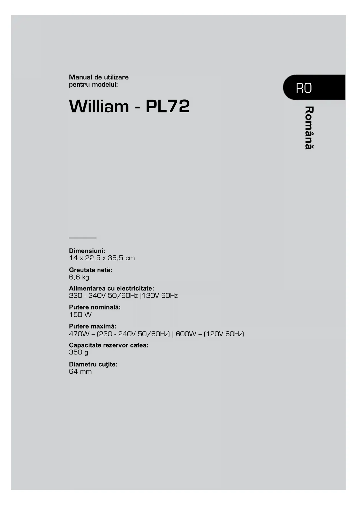 Avertizari generale Acest manual este o parte integran- tă şi esenţială a produsului. Citiţi cu atenţie avertismentele din manual, deoarece furnizează indicaţii impor- tante referitoare la siguranţa instală- rii, a utilizării şi a întreţinerii. Păstraţi aceste instrucţiuni pentru consultări viitoare. - Citiţi cu atenţie acest manual. - Păstraţi toate ambalajele (pungi de plastic, polistiren expandat etc.) la distanţă de copii. - Aceste instructiuni avertizeaza im- potriva folosirii neadecvate. - Acest aparat este proiectat excluziv pentru a rasni cafea in boabe. - Acest aparat este proiectat pentru utilizare casnică şi activități similare, cum ar : bucătării ale personalului din magazine, birouri şi alte medii de lucru; ferme; de către clienții ho- telurilor, motelurilor şi altor tipuri de medii rezidențiale; cazare de tipul bed & breakfast sau asemănător. Nu este indicat pentru functionare con- tinua de tip profesional - Nu lăsați aparatul nesupravegheat la îndemâ- na copiilor. Copiii trebuie suprave- gheati mereu pentru a asigura ca nu se joaca cu aparatul. - Nu instalati aparatul intr-o zona unde poate folosit un jet de apa. - Aparatul poate utilizat de către persoanele cu handicap zic, senzo- rial sau mental, sau fără experiență şi cunoştințe, dacă sunt supravegheate sau primesc indicații cu privire la modul de utilizare a dispozitivului în siguranță şi cunoscând potențialele pericole. - Aparatul trebuie să e instalat in- tr-un loc unde poate folosit doar de către persoane avizate şi cu expe- rienta, in special in ceea ce priveşte normele de siguranță şi higienă. - Declinăm orice responsabilitate în caz de desigilare a vreunui compo- nent al aparatului. - Curățarea şi întreținerea nu trebuie să e efectuate de către copiii fără supraveghere. - Orice altă utilizare faţă de cele men- ţionate mai sus este necorespunză- toare şi poate o sursă de pericol; AVERTIZARI IMPORTANTEWilliam - PL72