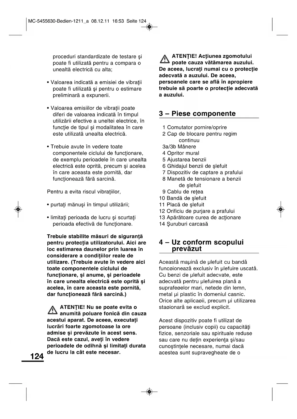 | 4 – Utilizare conform scopului prevăzut 124 | 10 – Întreținere și protecția mediului | 130 | |