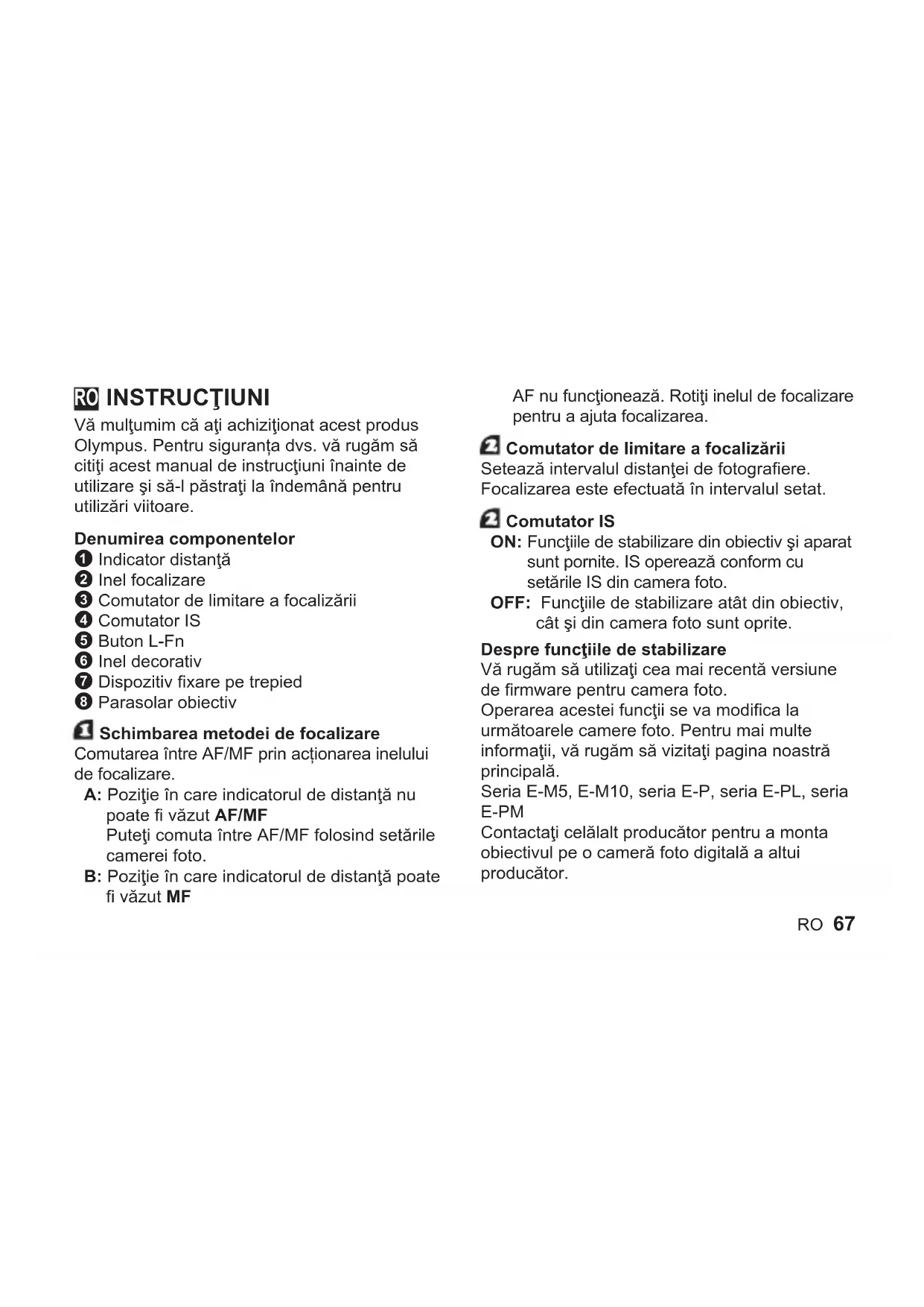 - Não aponte a objetiva da câmara para o sol. Os raios irão atravessar a objetiva e concentrar-se no interior da câmara, possivelmente causando uma avaria ou incêndio. Micro Four Thirds e o logótipo Micro Four Thirds são marcas comerciais ou marcas registadas da OLYMPUS CORPORATIONRO 67 INSTRUCŢIUNI Vă mulţumim că aţi achiziţionat acest produs Olympus. Pentru siguranța dvs. vă rugăm să citiţi acest manual de instrucţiuni înainte de utilizare şi să-l păstraţi la îndemână pentru utilizări viitoare. Denumirea componentelor 1 Indicator distanţă 2 Inel focalizare 3 Comutator de limitare a focalizării 4 Comutator IS 5 Buton L-Fn 6 Inel decorativ 7 Dispozitiv fixare pe trepied 8 Parasolar obiectiv Schimbarea metodei de focalizare Comutarea între AF/MF prin acționarea inelului de focalizare. A: Poziţie în care indicatorul de distanţă nu poate fi văzut AF/MF Puteţi comuta între AF/MF folosind setările camerei foto. B: Poziţie în care indicatorul de distanţă poate fi văzut MF AF nu funcţionează. Rotiţi inelul de focalizare pentru a ajuta focalizarea. Comutator de limitare a focalizării Setează intervalul distanţei de fotografiere. Focalizarea este efectuată în intervalul setat. Comutator IS ON: Funcţiile de stabilizare din obiectiv şi aparat sunt pornite. IS operează conform cu setările IS din camera foto. OFF: Funcţiile de stabilizare atât din obiectiv, cât şi din camera foto sunt oprite. Despre funcţiile de stabilizare Vă rugăm să utilizaţi cea mai recentă versiune de firmware pentru camera foto. Operarea acestei funcţii se va modifica la următoarele camere foto. Pentru mai multe informaţii, vă rugăm să vizitaţi pagina noastră principală. Seria E-M5, E-M10, seria E-P, seria E-PL, seria E-PM Contactaţi celălalt producător pentru a monta obiectivul pe o cameră foto digitală a altui producător. RO68 RO Buton L-Fn AF nu mai funcţionează în timp ce butonul este apăsat. detașarea dispozitivului de fixare pe trepied şi ataşarea inelului decorativ detașarea dispozitivului de fixare pe trepied: Rotiţi butonul dispozitivului de fixare pe trepied spre stânga pentru a-l slăbi 1. Rotiţi dispozitivul de fixare pe trepied spre stânga, aliniați-l cu marcajul 2, și scoateți-l din corpul obiectivului 3. Ataşarea inelului decorativ: Aliniaţi marcajele şi introduceţi inelul decorativ 1, apoi rotiţi-l spre dreapta până ce se opreşte 2. Cum se utilizează parasolarul obiectivului Trageţi-l în afară până se opreşte 1, iar apoi rotiţi-l spre dreapta 2. Parasolarul obiectivului nu poate fi îndepărtat de pe obiectiv. Observaţii privind fotografierea