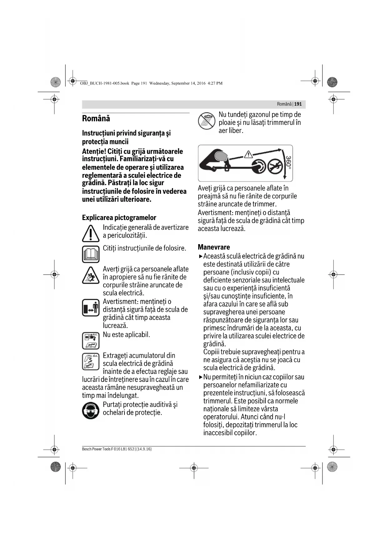 Желі қуатын тексеру, зарядтау құралын керек болса Bosch электр құралдарының авторизацияланған клиенттерге қызмет көрсету орталықтарында тексеріңіз Симптомдар Мүмкін болған себептер Көмек OBJ_BUCH-1981-005.book Page 190 Wednesday, September 14, 2016 4:27 PMRomână | 191 Bosch Power Tools F 016 L81 652 | (14.9.16) Română Instrucţiuni privind siguranţa şi protecţia muncii Atenţie! Citiţi cu grijă următoarele instrucţiuni. Familiarizaţi-vă cu elementele de operare şi utilizarea reglementară a sculei electrice de grădină. Păstraţi la loc sigur instrucţiunile de folosire în vederea unei utilizări ulterioare. Explicarea pictogramelor Indicaţie generală de avertizare a periculozităţii. Citiţi instrucţiunile de folosire. Averţi grijă ca persoanele aflate în apropiere să nu fie rănite de corpurile străine aruncate de scula electrică. Avertisment: menţineţi o distanţă sigură faţă de scula de grădină cât timp aceasta lucrează. Nu este aplicabil. Extrageţi acumulatorul din scula electrică de grădină înainte de a efectua reglaje sau lucrări de întreţinere sau în cazul în care aceasta rămâne nesupravegheată un timp mai îndelungat. Purtaţi protecţie auditivă şi ochelari de protecţie. Nu tundeţi gazonul pe timp de ploaie şi nu lăsaţi trimmerul în aer liber. Aveţi grijă ca persoanele aflate în preajmă să nu fie rănite de corpurile străine aruncate de trimmer. Avertisment: menţineţi o distanţă sigură faţă de scula de grădină cât timp aceasta lucrează. Manevrare Această sculă electrică de grădină nu este destinată utilizării de către persoane (inclusiv copii) cu deficiente senzoriale sau intelectuale sau cu o experienţă insuficientă şi/sau cunoştinţe insuficiente, în afara cazului în care se află sub supravegherea unei persoane răspunzătoare de siguranţa lor sau primesc îndrumări de la aceasta, cu privire la utilizarea sculei electrice de grădină. Copiii trebuie supravegheaţi pentru a ne asigura că aceştia nu se joacă cu scula electrică de grădină. Nu permiteţi în niciun caz copiilor sau persoanelor nefamiliarizate cu prezentele instrucţiuni, să folosească trimmerul. Este posibil ca normele naţionale să limiteze vârsta operatorului. Atunci când nu-l folosiţi, depozitaţi trimmerul la loc inaccesibil copiilor. a.c. d.c. OBJ_BUCH-1981-005.book Page 191 Wednesday, September 14, 2016 4:27 PM192 | Română F 016 L81 652 | (14.9.16) Bosch Power Tools Nu folosiţi în niciun caz trimmerul dacă acesta prezintă capace sau echipamete de protecţie lipsă, deteriorate sau care nu sunt poziţionate corect. Înainte de utilizare cât şi după o lovitură, examinaţi scula electrică de grădină cu privire la semne de uzură sau defecţiuni iar dacă este cazul, daţi-o la reparat. Nu folosiți scula electrică de grădină dacă sunteți bolnavi sau vă aflați sub influența alcoolului, a drogurilor sau a medicamentelor. Purtaţi pantaloni lungi, grei, încălţăminte solidă şi mănuşi. Nu purtaţi îmbrăcăminte largă, bijuterii, pantaloni scurţi, sandale sau nu lucraţi desculţi. Dacă aveţi părul mai lung de nivelul umerilor, legaţi-l, pentru a evita prinderea acestuia în componentele de maşină aflate în mişcare. Atunci când lucraţi cu scula electrică de grădină, purtaţi ochelari de protecţie şi aparat de protecţie auditivă. Adoptaţi o poziţie stabilă şi păstraţi- vă întotdeauna echilibrul. Nu vă suprasolicitaţi. Nu folosiţi scula elecrică de grădină în niciun caz atunci când în imediata apropiere se află persoane, mai ales copii sau animale de casă. Operatorul sau utilizatorul este ţinut răspunzător pentru accidente sau pagube provocate altor oameni sau bunurilor acestora. Înainte de a atinge cuţitul, aşteptaţi ca acesta să se oprească complet din mişcare de rotaţie. Cuţitul continuă să se mai rotească după oprirea motorului, putând provoca răniri. Lucraţi numai la lumina zilei sau la lumină artificială bună. În caz de condiţii meteo nefavorabile, mai ales atunci când se apropie furtuna, nu lucraţi cu trimmerul. Folosirea trimmerului în iarbă udă diminuează performanţele de lucru ale acestuia. Deconectaţi trimmerul în vederea transportului de la/spre locul de intervenţie. Porniţi scula electrică de grădină numai după ce v-aţi asigurat că mâinile şi picioarele dumneavoastră se află la o distanţă suficient de mare de cuţitele de tăiere. Nu veniţi cu mâinile şi picioarele în apropierea elementelor de tăiere care se rotesc. Scoateţi acumulatorul înainte de a înlocui cuţitul. Nu folosiţi în niciun caz elemente de tăiere de metal pentru acest trimmer. Controlaţi şi întreţineţi regulat trimmerul. Daţi la reparat trimmerul numai la ateliere service autorizate. Asiguraţi-vă întotdeauna că fantele de aerisire nu sunt acoperite cu resturi de iarbă. Scoateţi acumulatorul: – întotdeauna, atunci când lăsaţi nesupravegheată pentru un timp scula electrică de grădină – înainte de a înlocui cuţitul – înainte de curăţare, sau înaintea unei intervenţii asupra trimmerului OBJ_BUCH-1981-005.book Page 192 Wednesday, September 14, 2016 4:27 PMRomână | 193 Bosch Power Tools F 016 L81 652 | (14.9.16) Depozitaţi scula electrică de grădină la loc sigur, uscat, inaccesibil copiilor. Nu aşezaţi alte obiecte pe scula electrică de grădină. Din considerente legate de siguranţa şi protecţia muncii, schimbaţi piesele uzate sau deteriorate. Asiguraţi-vă că piesele noi utilizate la schimbare provin de la Bosch. Nu puneţi niciodată în funcţiune scula electrică de grădină fără ca accesoriile aferente să fie montate. Indicaţii privind manevrarea optimă a acumulatorului Înainte de a introduce acumul