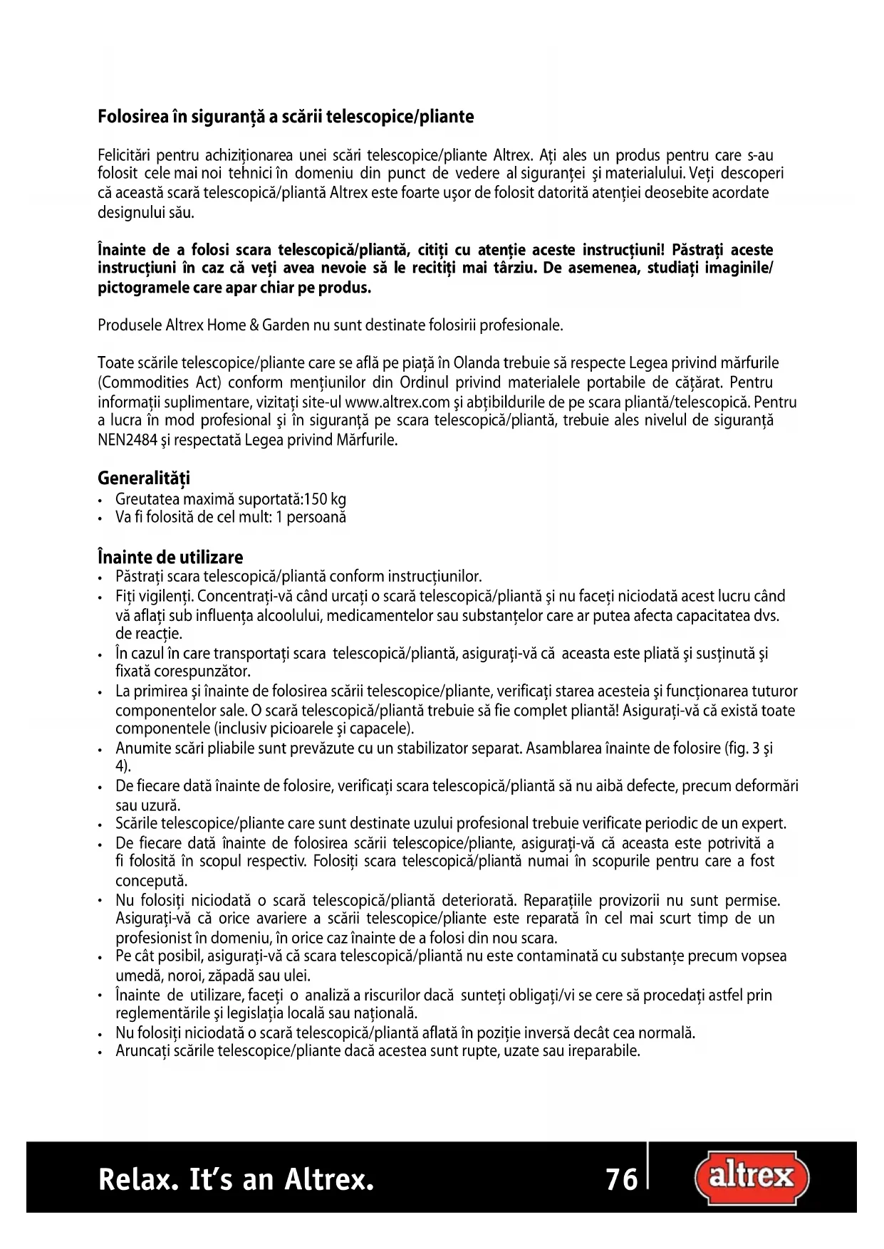 5.Folosirea în siguranţă a scării telescopice/pliante Felicitări pentru achiziţionarea unei scări telescopice/pliante Altrex. Aţi ales un produs pentru care s-au folosit cele mai noi tehnici în domeniu din punct de vedere al siguranţei şi materialului. Veţi descoperi că această scară telescopică/pliantă Altrex este foarte uşor de folosit datorită atenţiei deosebite acordate designului său. Înainte de a folosi scara telescopică/pliantă, citiţi cu atenţie aceste instrucţiuni! Păstraţi aceste instrucţiuni în caz că veţi avea nevoie să le recitiţi mai târziu. De asemenea, studiaţi imaginile/ pictogramele care apar chiar pe produs. Produsele Altrex Home & Garden nu sunt destinate folosirii profesionale. Toate scările telescopice/pliante care se află pe piaţă în Olanda trebuie să respecte Legea privind mărfurile (Commodities Act) conform menţiunilor din Ordinul privind materialele portabile de căţărat. Pentru informaţii suplimentare, vizitaţi site-ul www.altrex.com şi abţibildurile de pe scara pliantă/telescopică. Pentru a lucra în mod profesional şi în siguranţă pe scara telescopică/pliantă, trebuie ales nivelul de siguranţă NEN2484 şi respectată Legea privind Mărfurile. Generalităţi Greutatea maximă suportată:150 kg Va fi folosită de cel mult: 1 persoană Înainte de utilizare Păstraţi scara telescopică/pliantă conform instrucţiunilor. Fiţi vigilenţi. Concentraţi-vă când urcaţi o scară telescopică/pliantă şi nu faceţi niciodată acest lucru când vă aflaţi sub influenţa alcoolului, medicamentelor sau substanţelor care ar putea afecta capacitatea dvs. de reacţie. În cazul în care transportaţi scara telescopică/pliantă, asiguraţi-vă că aceasta este pliată şi susţinută şi fixată corespunzător. La primirea şi înainte de folosirea scării telescopice/pliante, verificaţi starea acesteia şi funcţionarea tuturor componentelor sale. O scară telescopică/pliantă trebuie să fie complet pliantă! Asiguraţi-vă că există toate componentele (inclusiv picioarele şi capacele). Anumite scări pliabile sunt prevăzute cu un stabilizator separat. Asamblarea înainte de folosire (fig. 3 şi 4). De fiecare dată înainte de folosire, verificaţi scara telescopică/pliantă să nu aibă defecte, precum deformări sau uzură. Scările telescopice/pliante care sunt destinate uzului profesional trebuie verificate periodic de un expert. De fiecare dată înainte de folosirea scării telescopice/pliante, asiguraţi-vă că aceasta este potrivită a fi folosită în scopul respectiv. Folosiţi scara telescopică/pliantă numai în scopurile pentru care a fost concepută. Nu folosiţi niciodată o scară telescopică/pliantă deteriorată. Reparaţiile provizorii nu sunt permise. Asiguraţi-vă că orice avariere a scării telescopice/pliante este reparată în cel mai scurt timp de un profesionist în domeniu, în orice caz înainte de a folosi din nou scara. Pe cât posibil, asiguraţi-vă că scara telescopică/pliantă nu este contaminată cu substanţe precum vopsea umedă, noroi, zăpadă sau ulei. Înainte de utilizare, faceţi o analiză a riscurilor dacă sunteţi obligaţi/vi se cere să procedaţi astfel prin reglementările şi legislaţia locală sau naţională. Nu folosiţi niciodată o scară telescopică/pliantă aflată în poziţie inversă decât cea normală. Aruncaţi scările telescopice/pliante dacă acestea sunt rupte, uzate sau ireparabile.