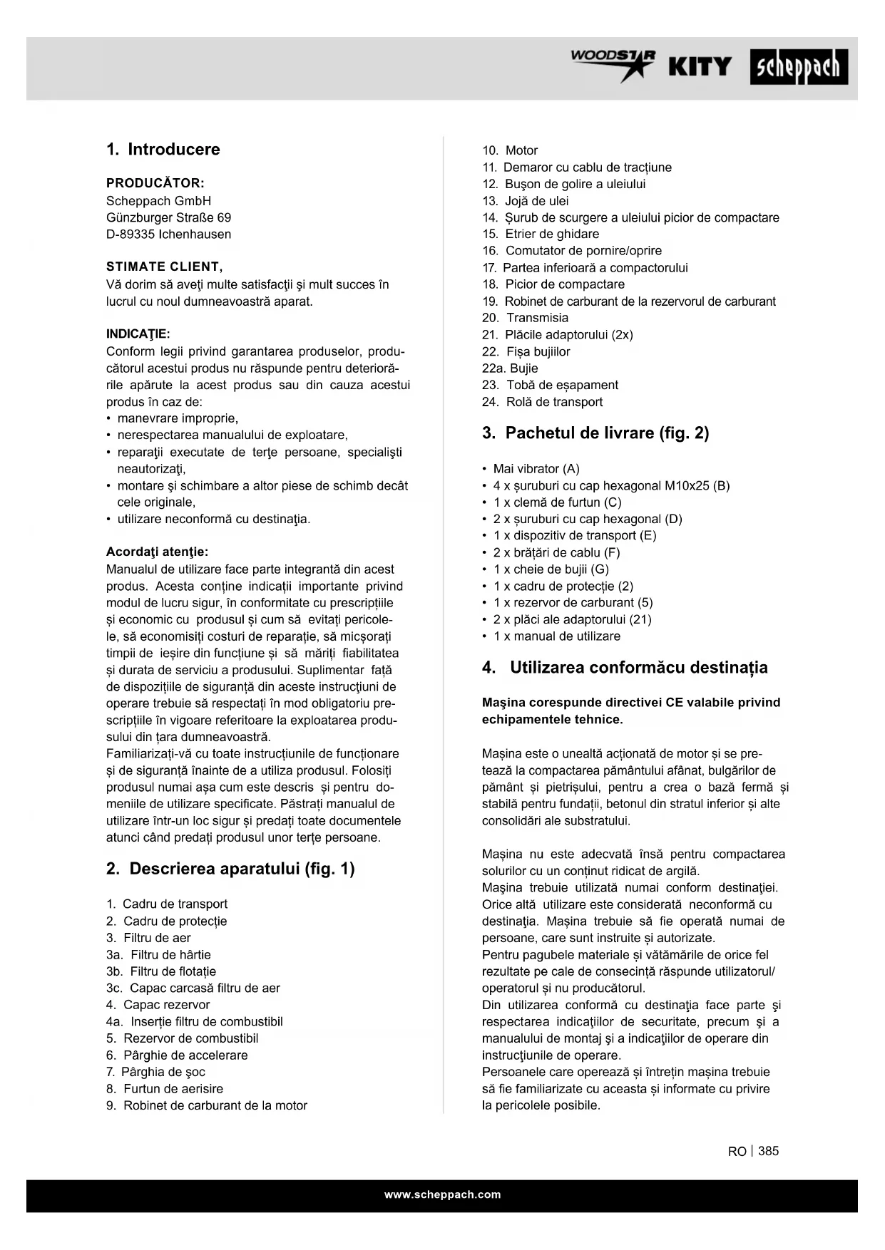 Maşina corespunde directivei CE valabile privind echipamentele tehnice. Mașina este o unealtă acționată de motor și se pre- tează la compactarea pământului afânat, bulgărilor de pământ și pietrișului, pentru a crea o bază fermă și stabilă pentru fundații, betonul din stratul inferior și alte consolidări ale substratului. Mașina nu este adecvată însă pentru compactarea solurilor cu un conținut ridicat de argilă. Maşina trebuie utilizată numai conform destinaţiei. Orice altă utilizare este considerată neconformă cu destinaţia. Mașina trebuie să e operată numai de persoane, care sunt instruite și autorizate. Pentru pagubele materiale și vătămările de orice fel rezultate pe cale de consecință răspunde utilizatorul/ operatorul și nu producătorul. Din utilizarea conformă cu destinaţia face parte şi respectarea indicaţiilor de securitate, precum şi a manualului de montaj şi a indicaţiilor de operare din instrucţiunile de operare. Persoanele care operează și întrețin mașina trebuie să e familiarizate cu aceasta și informate cu privire la pericolele posibile.