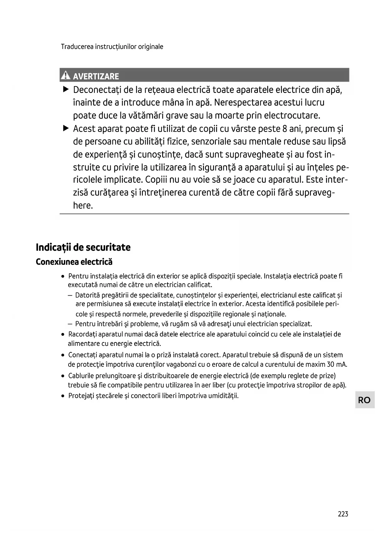 AVERTI ZARE AVERTIZARE Deconectați de la rețeaua electrică toate aparatele electrice din apă, înainte de a introduce mâna în apă. Nerespectarea acestui lucru poate duce la vătămări grave sau la moarte prin electrocutare. Acest aparat poate fi utilizat de copii cu vârste peste 8 ani, precum și de persoane cu abilități fizice, senzoriale sau mentale reduse sau lipsă de experiență și cunoștințe, dacă sunt supravegheate și au fost in- struite cu privire la utilizarea în siguranță a aparatului și au înțeles pe- ricolele implicate. Copiii nu au voie să se joace cu aparatul. Este inter- zisă curăţarea şi întreţinerea curentă de către copii fără supraveg- here.
