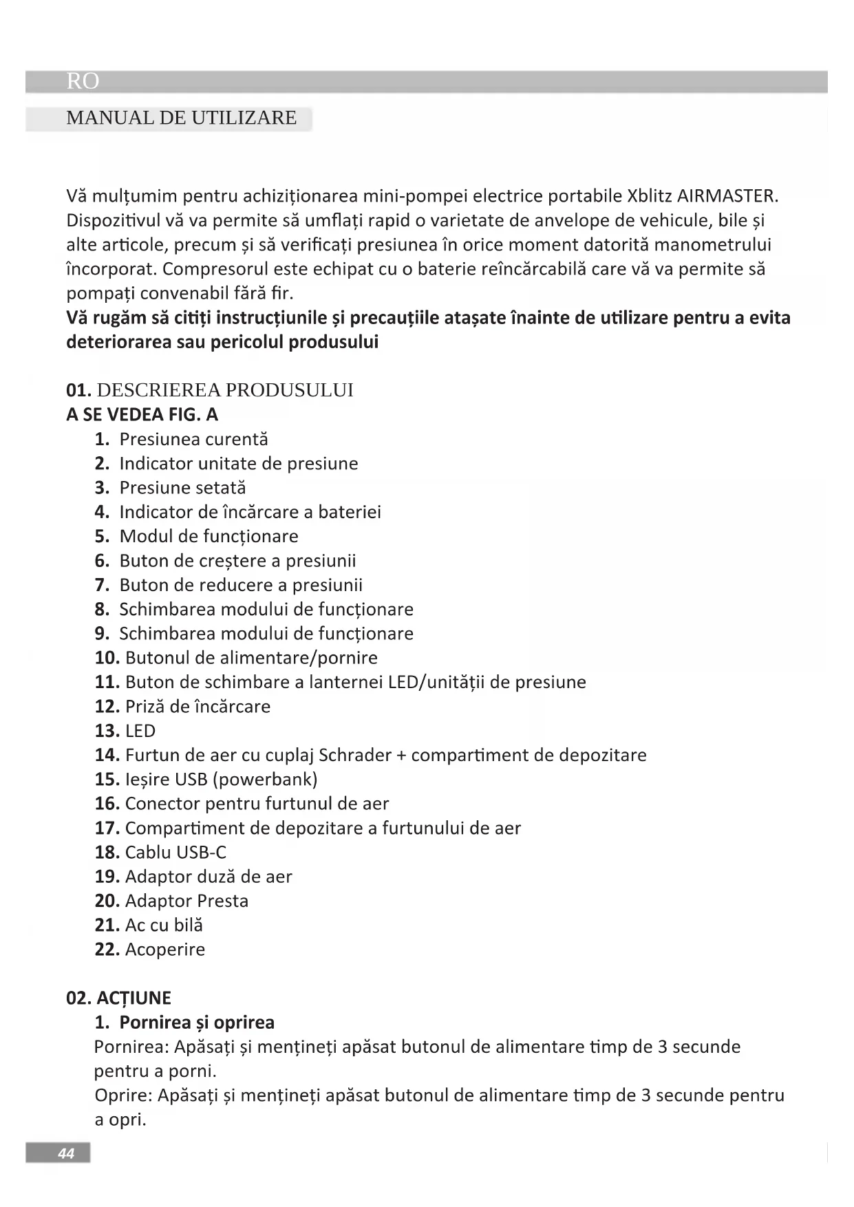 Vă mulțumim pentru achiziționarea mini-pompei electrice portabile Xblitz AIRMASTER. Dispozivul vă va permite să umați rapid o varietate de anvelope de vehicule, bile și alte arcole, precum și să vericați presiunea în orice moment datorită manometrului încorporat. Compresorul este echipat cu o baterie reîncărcabilă care vă va permite să pompați convenabil fără r. Vă rugăm să ciți instrucțiunile și precauțiile atașate înainte de ulizare pentru a evita deteriorarea sau pericolul produsului