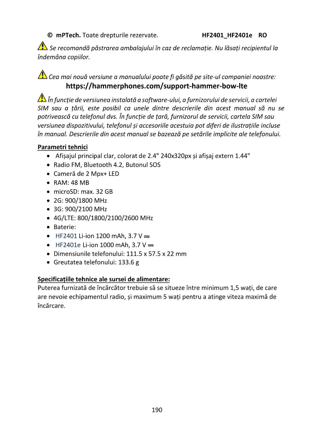 Se recomandă păstrarea ambalajului în caz de reclamație. Nu lăsați recipientul la îndemâna copiilor. Cea mai nouă versiune a manualului poate fi găsită pe site-ul companiei noastre: https://hammerphones.com/support-hammer-bow-lte În funcție de versiunea instalată a software-ului, a furnizorului de servicii, a cartelei SIM sau a țării, este posibil ca unele dintre descrierile din acest manual să nu se potrivească cu telefonul dvs. În funcție de țară, furnizorul de servicii, cartela SIM sau versiunea dispozitivului, telefonul și accesoriile acestuia pot diferi de ilustrațiile incluse în manual. Descrierile din acest manual se bazează pe setările implicite ale telefonului. Parametri tehnici