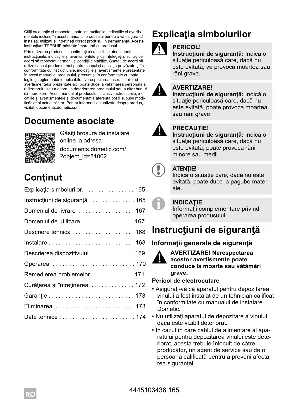- În cazul în care cablul de alimentare al apa- ratului pentru depozitarea vinului este dete- riorat, acesta trebuie înlocuit de către producător, un agent de service sau de o persoană calificată pentru a preveni afecta- rea siguranţei. Găsiţi broşura de instalare online la adresa documents.dometic.com/ ?object_id=81002 PERICOL! Instrucţiuni de siguranţă: Indică o situaţie periculoasă care, dacă nu este evitată, va provoca moartea sau răni grave. AVERTIZARE! Instrucţiuni de siguranţă: Indică o situaţie periculoasă care, dacă nu este evitată, poate provoca moartea sau răni grave. PRECAUŢIE! Instrucţiuni de siguranţă: Indică o situaţie periculoasă care, dacă nu este evitată, poate provoca răni minore sau medii. ATENŢIE! Indică o situaţie care, dacă nu este evitată, poate duce la pagube materi- ale. INDICAŢIE Informaţii complementare privind operarea produsului.166 4445103438