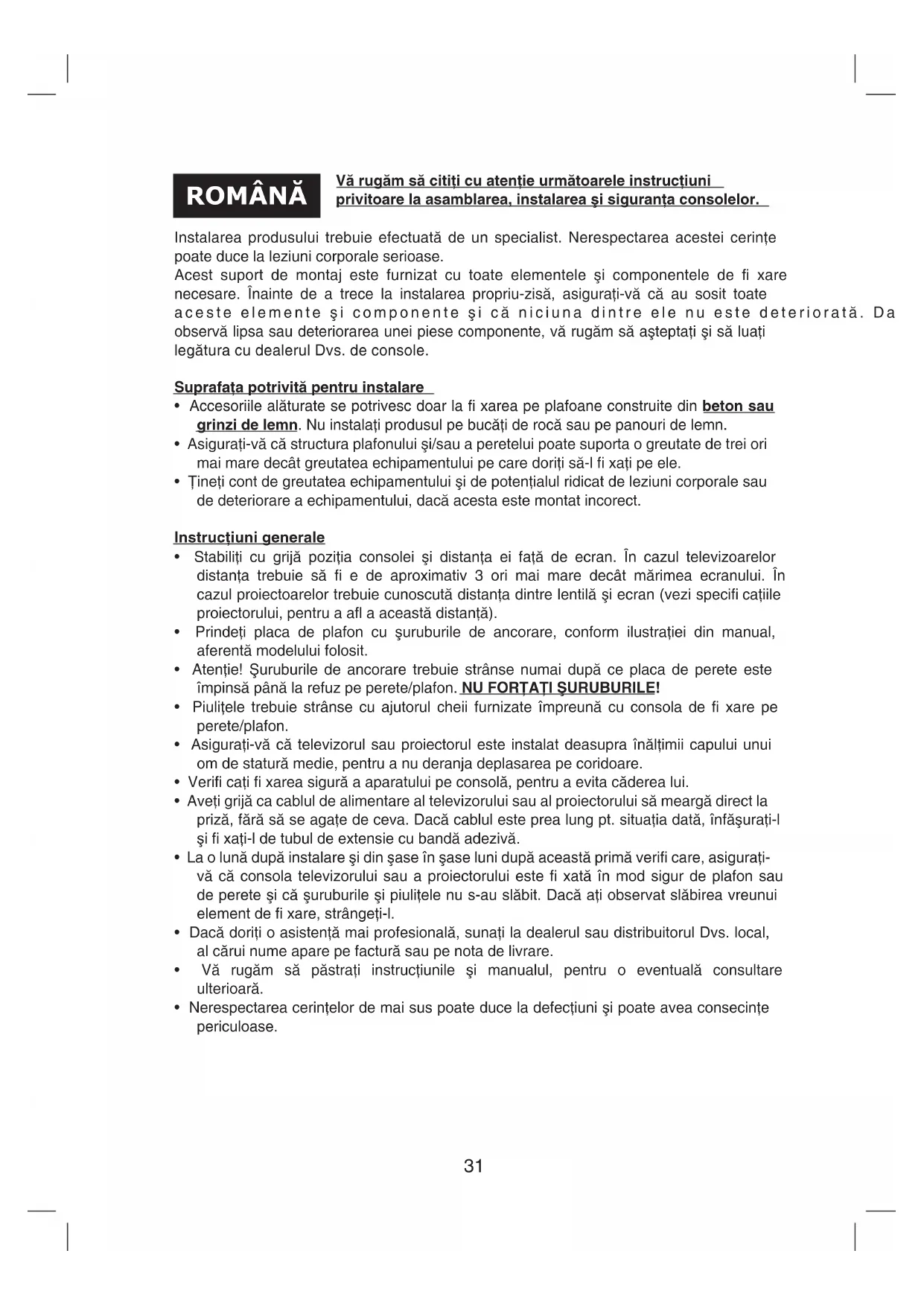 - Všechna loga a názvy výrobků jsou obchodní značky nebo registrované obchodní značky příslušných vlastníků a jsou chráněny příslušnými zákony.31 Vă rugăm să citiţi cu atenţie următoarele instrucţiuni privitoare la asamblarea, instalarea şi siguranţa consolelor. Instalarea produsului trebuie efectuată de un specialist. Nerespectarea acestei cerinţe poate duce la leziuni corporale serioase. Acest suport de montaj este furnizat cu toate elementele şi componentele de fi xare necesare. Înainte de a trece la instalarea propriu-zisă, asiguraţi-vă că au sosit toate aceste elemente şi componente şi că niciuna dintre ele nu este deteriorată. Dacă se observă lipsa sau deteriorarea unei piese componente, vă rugăm să aşteptaţi şi să luaţi legătura cu dealerul Dvs. de console. Suprafaţa potrivită pentru instalare