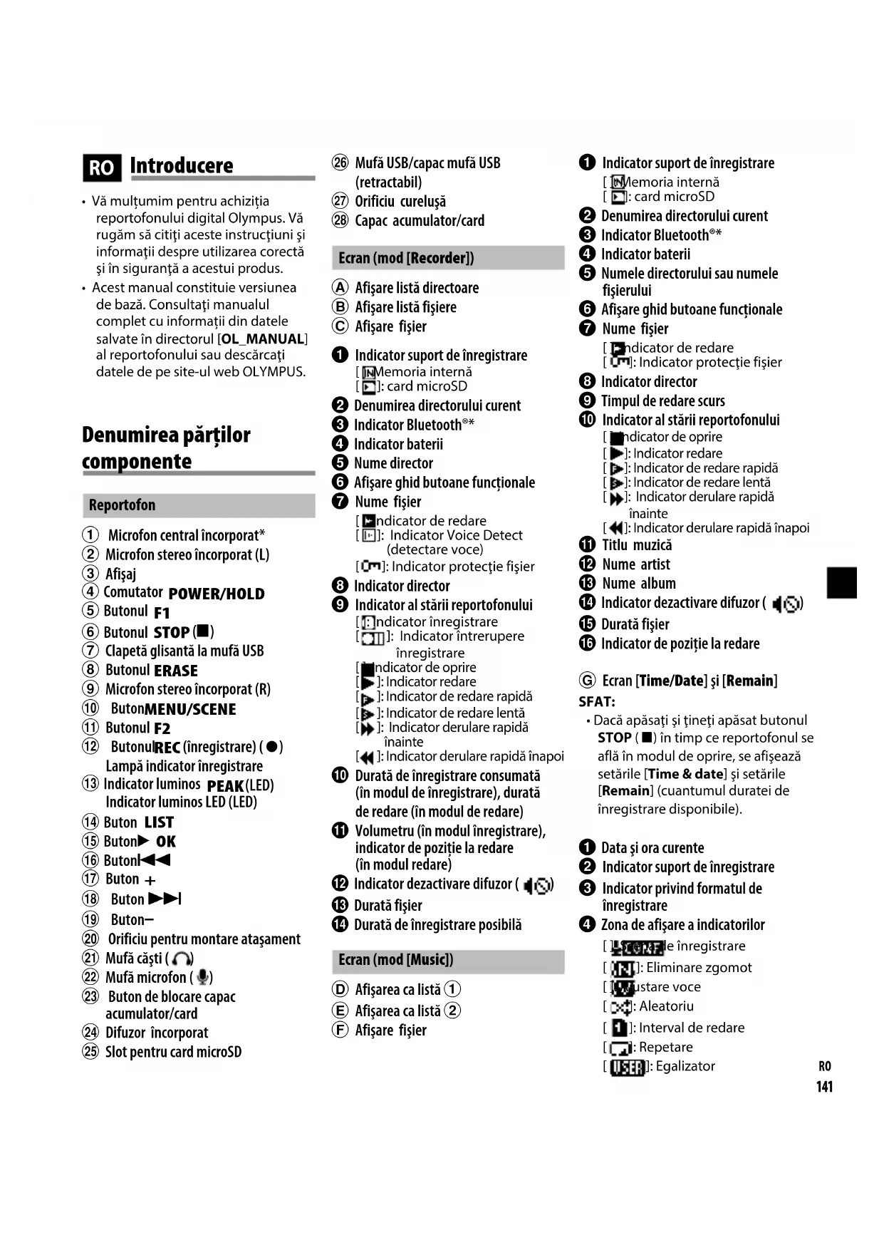 - Acest manual constituie versiunea de bază. Consultaţi manualul complet cu informații din datele salvate în directorul [OL_MANUAL] al reportofonului sau descărcaţi datele de pe site-ul web OLYMPUS. Introducere