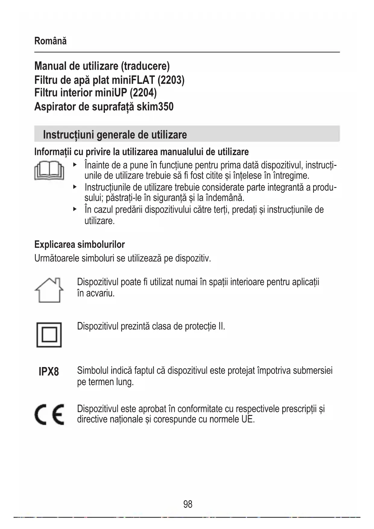 Manual de utilizare (traducere) Filtru de apă plat miniFLAT (2203) Filtru interior miniUP (2204) Aspirator de suprafaţă skim350 Instrucţiuni generale de utilizare Informaţii cu privire la utilizarea manualului de utilizare ▶ Înainte de a pune în funcţiune pentru prima dată dispozitivul, instrucţi