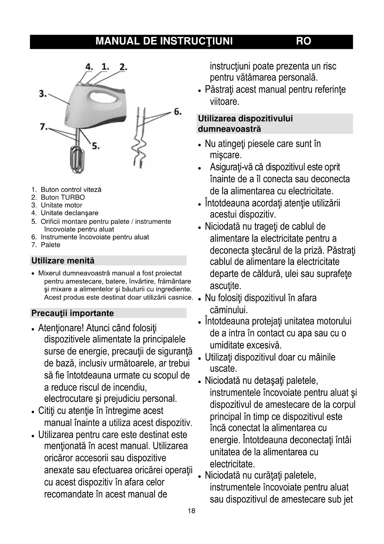 - Mixerul dumneavoastră manual a fost proiectat pentru amestecare, batere, invartire, framantareși mixare a alimentelorși bauturii cu ingrediente. Acest produs este destinat doar utilizarii casnice.