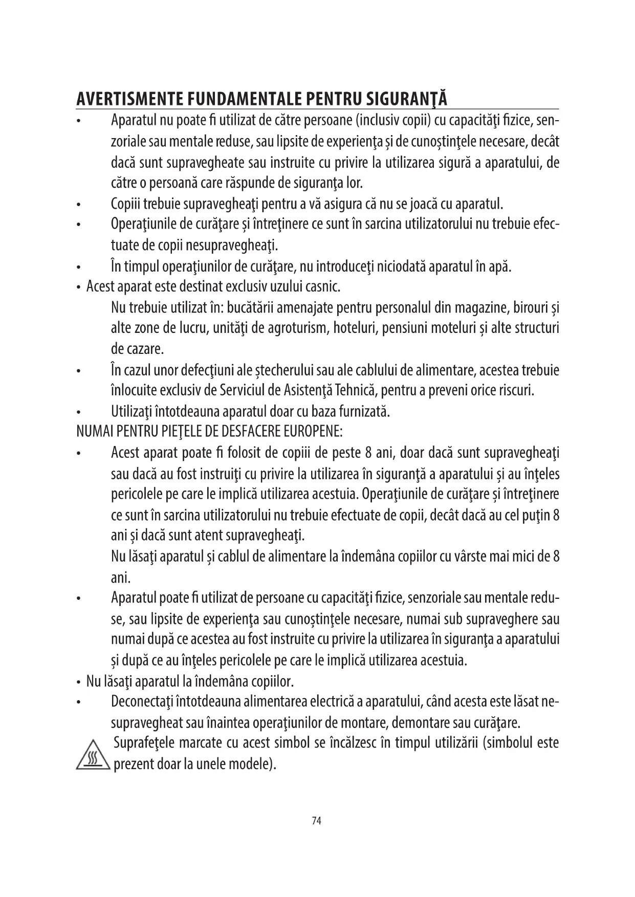 - Deconectaţi întotdeauna alimentarea electrică a aparatului, când acesta este lăsat ne- supravegheat sau înaintea operaţiunilor de montare, demontare sau curăţare. Suprafeţele marcate cu acest simbol se încălzesc în timpul utilizării (simbolul este prezent doar la unele modele).75