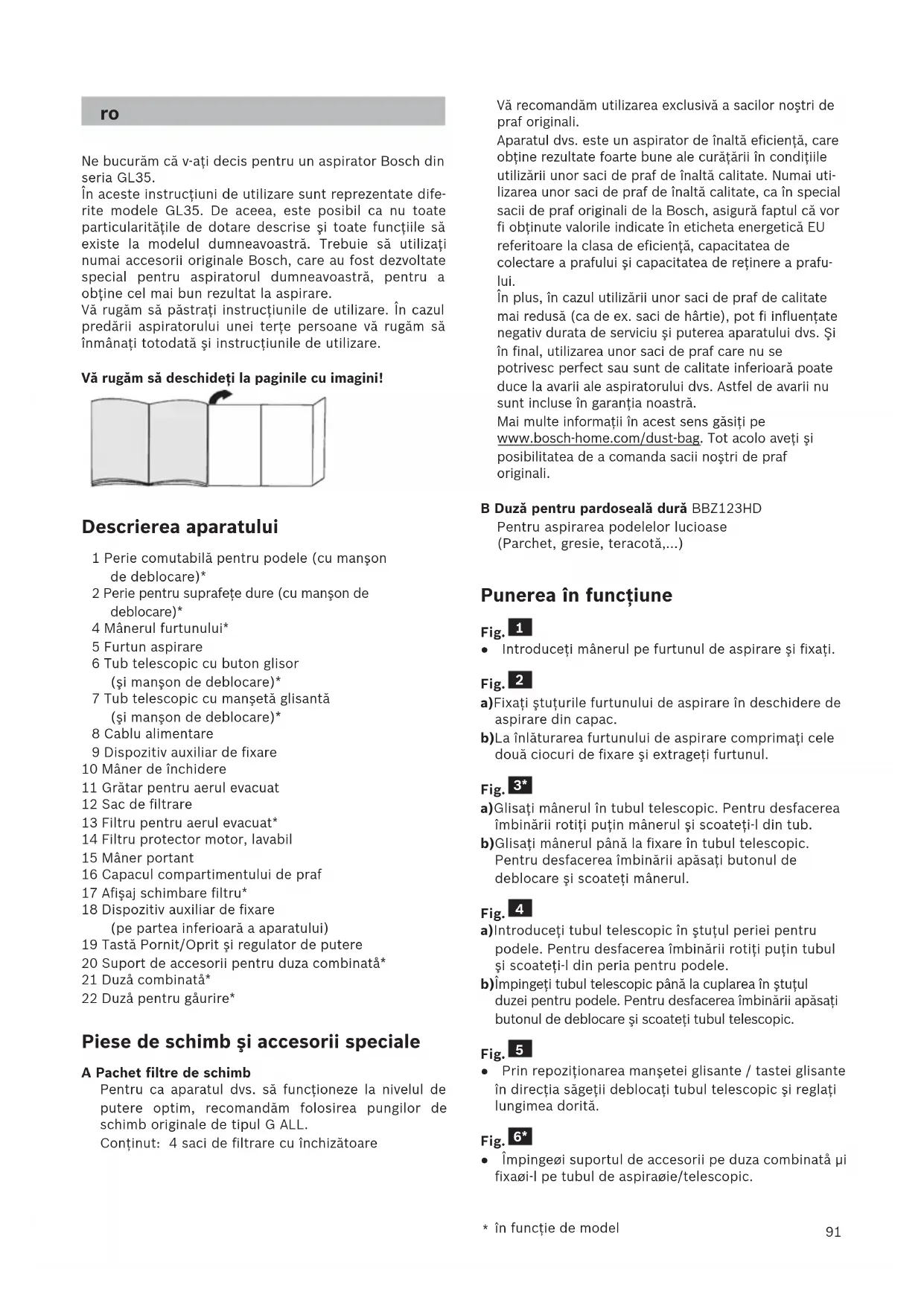 Ne bucurăm că v-aţi decis pentru un aspirator Bosch din seria GL35. În aceste instrucţiuni de utilizare sunt reprezentate dife- rite modele GL35. De aceea, este posibil ca nu toate particularităţile de dotare descrise şi toate funcţiile să existe la modelul dumneavoastră. Trebuie să utilizaţi numai accesorii originale Bosch, care au fost dezvoltate special pentru aspiratorul dumneavoastră, pentru a obţine cel mai bun rezultat la aspirare. Vă rugăm să păstraţi instrucţiunile de utilizare. În cazul predării aspiratorului unei terţe persoane vă rugăm să înmânaţi totodată şi instrucţiunile de utilizare. Vă rugăm să deschideţi la paginile cu imagini! Descrierea aparatului 1 Perie comutabilă pentru podele (cu manşon de deblocare)* 2 Perie pentru suprafeţe dure (cu manşon de deblocare)* 4 Mânerul furtunului* 5 Furtun aspirare 6 Tub telescopic cu buton glisor (şi manşon de deblocare)* 7 Tub telescopic cu manşetă glisantă (şi manşon de deblocare)* 8 Cablu alimentare 9 Dispozitiv auxiliar de fixare 10 Mâner de închidere 11 Grătar pentru aerul evacuat 12 Sac de filtrare 13 Filtru pentru aerul evacuat* 14 Filtru protector motor, lavabil 15 Mâner portant 16 Capacul compartimentului de praf 17 Afişaj schimbare filtru* 18 Dispozitiv auxiliar de fixare (pe partea inferioară a aparatului) 19 Tastă Pornit/Oprit şi regulator de putere 20 Suport de accesorii pentru duza combinatå* 21 Duzå combinatå* 22 Duzå pentru gåurire* Piese de schimb şi accesorii speciale A Pachet filtre de schimb Pentru ca aparatul dvs. să funcţioneze la nivelul de putere optim, recomandăm folosirea pungilor de schimb originale de tipul G ALL. Conţinut: 4 saci de filtrare cu închizătoare