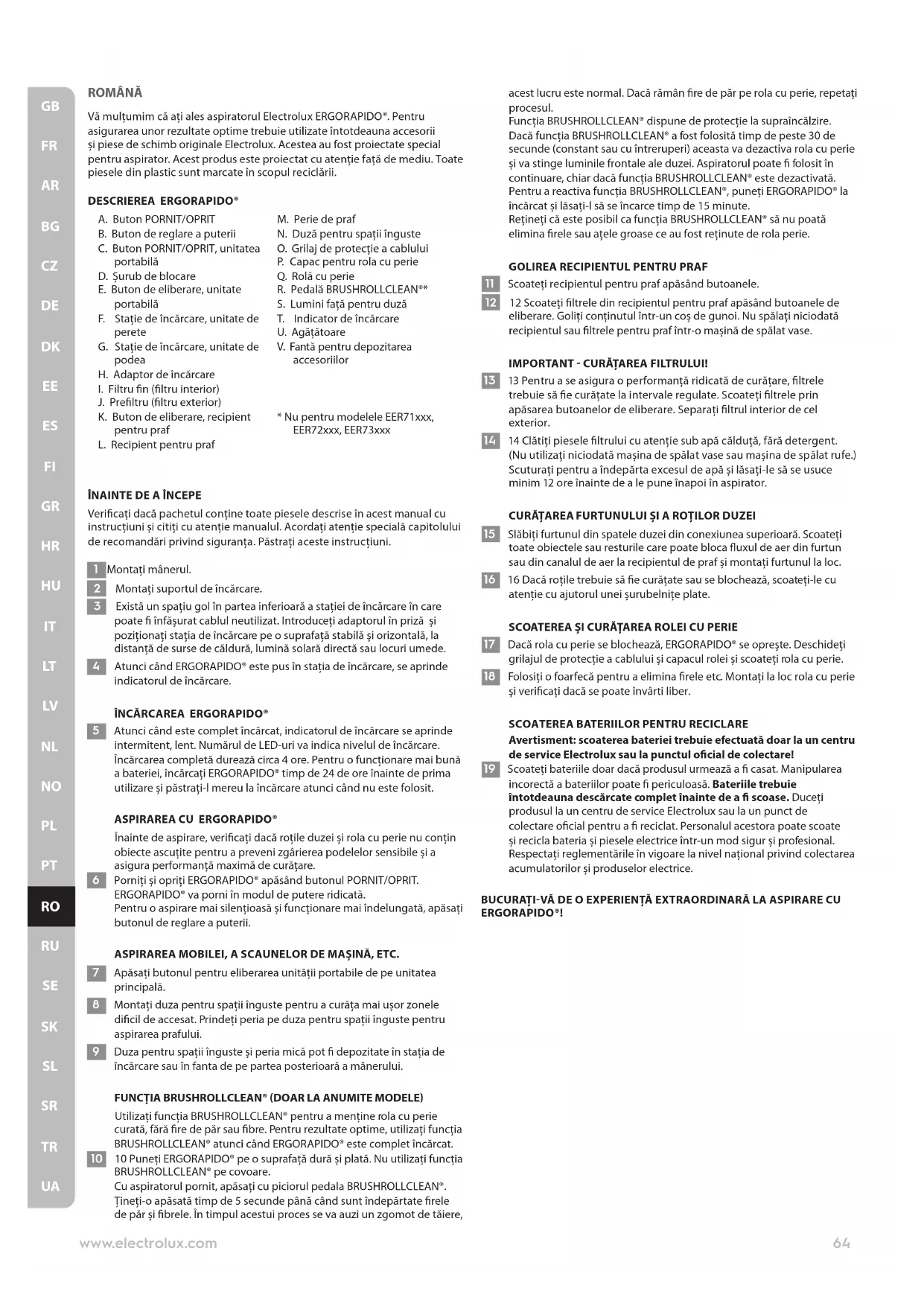 Avertisment: scoaterea bateriei trebuie efectuată doar la un centru de service Electrolux sau la punctul ocial de colectare! 19 Scoateți bateriile doar dacă produsul urmează a casat. Manipularea incorectă a bateriilor poate periculoasă. Bateriile trebuie întotdeauna descărcate complet înainte de a scoase. Duceți produsul la un centru de service Electrolux sau la un punct de colectare ocial pentru a reciclat. Personalul acestora poate scoate și recicla bateria și piesele electrice într-un mod sigur și profesional. Respectați reglementările în vigoare la nivel naţional privind colectarea acumulatorilor și produselor electrice. BUCURAȚI-VĂ DE O EXPERIENȚĂ EXTRAORDINARĂ LA ASPIRARE CU ERGORAPIDO®!