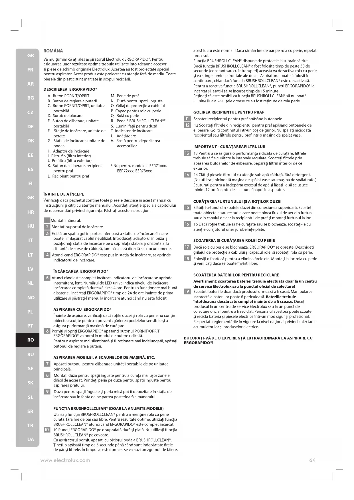 Avertisment: scoaterea bateriei trebuie efectuată doar la un centru de service Electrolux sau la punctul ocial de colectare! 19 Scoateți bateriile doar dacă produsul urmează a casat. Manipularea incorectă a bateriilor poate periculoasă. Bateriile trebuie întotdeauna descărcate complet înainte de a scoase. Duceți produsul la un centru de service Electrolux sau la un punct de colectare ocial pentru a reciclat. Personalul acestora poate scoate și recicla bateria și piesele electrice într-un mod sigur și profesional. Respectați reglementările în vigoare la nivel naţional privind colectarea acumulatorilor și produselor electrice. BUCURAȚI-VĂ DE O EXPERIENȚĂ EXTRAORDINARĂ LA ASPIRARE CU ERGORAPIDO®!