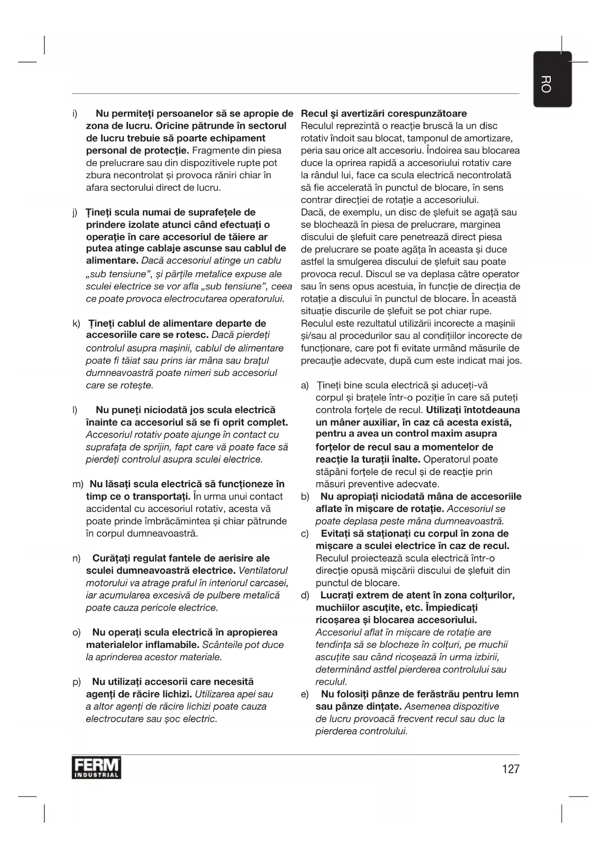 - Înainte de a scoate ştecherul din priză, opriţi întotdeauna maşina după utilizare. Debavurarea (g. C) Când efectuaţi operaţia de debavurare, veţi obţine cele mai bune rezultate la un unghi de înclinare cuprins între 30º şi 40º. Mişcaţi maşina înainte şi înapoi, folosind o presiune uşoară. Acest lucru va preveni decolorarea şi încălzirea piesei de prelucrare, evitându-se formarea de caneluri. Pentru lucrările de debavurare, nu utilizaţi niciodată discuri de tăiere abrazivă! Tăierea (g. D) Pentru tăiere, folosiţi o apărătoare de protecţie specială (neinclusă). Ţineţi cu fermitate piesa de prelucrare pentru a preveni apariţia vibraţiei şi nu înclinaţi sau nu aplicaţi presiune în timpul tăierii. Când operaţi, folosiţi presiune moderată adecvată materialului pe care lucraţi. Nu încetiniţi discurile aplicând contrapresiune laterală. Direcţia în care doriţi să tăiaţi este importantă. Maşina trebuie să opereze întotdeauna în direcţia tăierii; aşadar nu deplasaţi niciodată maşina în cealaltă direcţie! Există riscul ca maşina să se blocheze în tăietură, cauzând recul care vă va determina să pierdeţi controlul. Sfaturi pentru utilizarea optimă