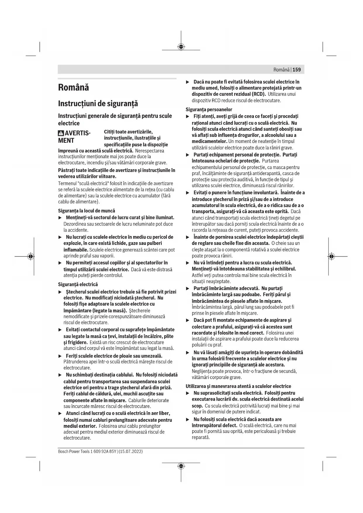 Ұсынылған литий-иондық аккумуляторлар қауіпті тауарларға қойылатын талаптарға бағынады. Пайдаланушы аккумуляторларды көшеде қосымша құжаттарсыз тасымалдай алады. Үшінші тұлғалар (мысалы, әуе көлігі немесе жіберу) орамаға және маркаларға қойылатын арнайы талаптарды сақтау керек. Жіберуге дайындау кезінде қауіпті жүктерді тасымалдау маманымен хабарласу керек. Аккумуляторды корпусы зақымдалған болса ғана жіберіңіз. Ашық түйіспелерді желімдеңіз және аккумуляторды орамада қозғалмайтындай ораңыз. Қажет болса, қосымша ұлттық ережелерді сақтаңыз. Кәдеге жарату Электр құралдарды, аккумуляторларды, керек-жарақтарды және орау материалдарын экологиялық тұрғыдан дұрыс утилизациялауға тапсыру керек. Электр құралдарды және аккумуляторларды/батареяларды үй қоқысына тастамаңыз! Тек қана ЕО елдері үшін: Ескі электрлік және электрондық құрылғылар туралы 2012/19/EU еуропалық директивасы және оның ұлттық заңнамада қолданылуы бойынша пайдалануға бұдан былай жарамсыз электрлік құралдарды және 2006/66/ ЕC еуропалық директивасы бойынша зақымдалған немесе ескірген аккумуляторларды/батареяларды бөлек жинап, қоршаған орта үшін қауіпсіз жолмен қайта өңдеуге жіберу қажет. Қате жолмен кәдеге жаратылған ескі электрлік және электрондық құрылғылар қауіпті заттардың болу мүмкіндігіне байланысты қоршаған ортаға және адам денсаулығына зиянды әсер тигізуі мүмкін. Аккумуляторлар/батареялар: Литий-иондық: Тасымалдау бөліміндегі нұсқауларды орындаңыз (қараңыз „Тасымалдау“, Бет158). 1 609 92A 85Y | (15.07.2022) Bosch Power ToolsRomână | 159 Română Instrucţiuni de siguranţă Instrucţiuni generale de siguranţă pentru scule electrice AVERTIS- MENT Citiţi toate avertizările, instrucţiunile, ilustraţiile şi specificaţiile puse la dispoziţie împreună cu această sculă electrică. Nerespectarea instrucţiunilor menţionate mai jos poate duce la electrocutare, incendiu şi/sau vătămări corporale grave. Păstraţi toate indicaţiile de avertizare şi instrucţiunile în vederea utilizărilor viitoare. Termenul "sculă electrică" folosit în indicaţiile de avertizare se referă la sculele electrice alimentate de la reţea (cu cablu de alimentare) sau la sculele electrice cu acumulator (fără cablu de alimentare). Siguranţa la locul de muncă u Menţineţi‑vă sectorul de lucru curat şi bine iluminat. Dezordinea sau sectoarele de lucru neluminate pot duce la accidente. u Nu lucraţi cu sculele electrice în mediu cu pericol de explozie, în care există lichide, gaze sau pulberi inflamabile. Sculele electrice generează scântei care pot aprinde praful sau vaporii. u Nu permiteţi accesul copiilor şi al spectatorilor în timpul utilizării sculei electrice. Dacă vă este distrasă atenţia puteţi pierde controlul. Siguranţă electrică u Ştecherul sculei electrice trebuie să fie potrivit prizei electrice. Nu modificaţi niciodată ştecherul. Nu folosiţi fişe adaptoare la sculele electrice cu împământare (legate la masă). Ştecherele nemodificate şi prizele corespunzătoare diminuează riscul de electrocutare. u Evitaţi contactul corporal cu suprafeţe împământate sau legate la masă ca ţevi, instalaţii de încălzire, plite şi frigidere. Există un risc crescut de electrocutare atunci când corpul vă este împământat sau legat la masă. u Feriţi sculele electrice de ploaie sau umezeală. Pătrunderea apei într‑o sculă electrică măreşte riscul de electrocutare. u Nu schimbaţi destinaţia cablului. Nu folosiţi niciodată cablul pentru transportarea sau suspendarea sculei electrice ori pentru a trage ştecherul afară din priză. Feriţi cablul de căldură, ulei, muchii ascuţite sau componente aflate în mişcare. Cablurile deteriorate sau încurcate măresc riscul de electrocutare. u Atunci când lucraţi cu o sculă electrică în aer liber, folosiţi numai cabluri prelungitoare adecvate pentru mediul exterior. Folosirea unui cablu prelungitor adecvat pentru mediul exterior diminuează riscul de electrocutare. u Dacă nu poate fi evitată folosirea sculei electrice în mediu umed, folosiţi o alimentare protejată printr-un dispozitiv de curent rezidual (RCD). Utilizarea unui dispozitiv RCD reduce riscul de electrocutare. Siguranţa persoanelor u Fiţi atenţi, aveţi grijă de ceea ce faceţi şi procedaţi raţional atunci când lucraţi cu o sculă electrică. Nu folosiţi scula electrică atunci când sunteţi obosiţi sau vă aflaţi sub influenţa drogurilor, a alcoolului sau a medicamentelor. Un moment de neatenţie în timpul utilizării sculelor electrice poate duce la răniri grave. u Purtaţi echipament personal de protecţie. Purtaţi întoteauna ochelari de protecţie. Purtarea echipamentului personal de protecţie, ca masca pentru p