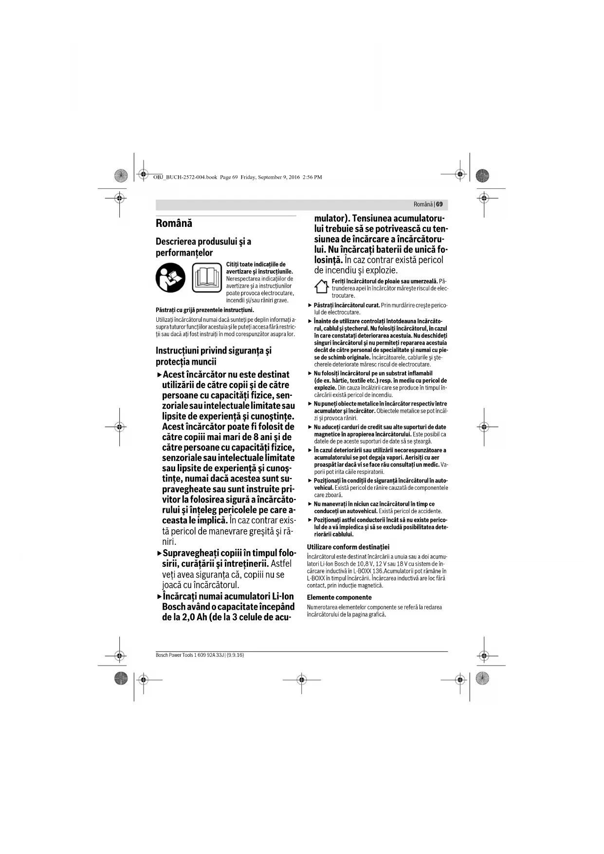 Борттық розетка, розетка, желі кабелі немесе зарядтау құралы бұзылған Борт кернеуі төмен Желі немесе борт кернеуін тексеру, зарядтау құралын керек болса Bosch электр құралдарының авторизацияланған клиенттерге қызмет көрсету орталықтарында тексеріңіз. OBJ_BUCH-2572-004.book Page 68 Friday, September 9, 2016 2:56 PMRomână | 69 Bosch Power Tools 1 609 92A 33J | (9.9.16) Română Descrierea produsului şi a performanţelor Citiţi toate indicaţiile de avertizare şi instrucţiunile. Nerespectarea indicaţiilor de avertizare şi a instrucţiunilor poate provoca electrocutare, incendii şi/sau răniri grave. Păstraţi cu grijă prezentele instrucţiuni. Utilizaţi încărcătorul numai dacă sunteţi pe deplin informaţi a- supra tuturor funcţiilor acestuia şi le puteţi accesa fără restric- ţii sau dacă aţi fost instruiţi în mod corespunzător asupra lor. Instrucţiuni privind siguranţa şi protecţia muncii Acest încărcător nu este destinat utilizării de către copii şi de către persoane cu capacităţi fizice, sen- zoriale sau intelectuale limitate sau lipsite de experienţă şi cunoştinţe. Acest încărcător poate fi folosit de către copiii mai mari de 8 ani şi de către persoane cu capacităţi fizice, senzoriale sau intelectuale limitate sau lipsite de experienţă şi cunoş- tinţe, numai dacă acestea sunt su- pravegheate sau sunt instruite pri- vitor la folosirea sigură a încărcăto- rului şi înţeleg pericolele pe care a- ceasta le implică. În caz contrar exis- tă pericol de manevrare greşită şi ră- niri. Supravegheaţi copiii în timpul folo- sirii, curăţării şi întreţinerii. Astfel veţi avea siguranţa că, copiii nu se joacă cu încărcătorul. Încărcaţi numai acumulatori Li-Ion Bosch având o capacitate începând de la 2,0 Ah (de la 3 celule de acu- mulator). Tensiunea acumulatoru- lui trebuie să se potrivească cu ten- siunea de încărcare a încărcătoru- lui. Nu încărcaţi baterii de unică fo- losinţă. În caz contrar există pericol de incendiu şi explozie. Feriţi încărcătorul de ploaie sau umerzeală. Pă- trunderea apei în încărcător măreşte riscul de elec- trocutare. Păstraţi încărcătorul curat. Prin murdărire creşte perico- lul de electrocutare. Înainte de utilizare controlaţi întotdeauna încărcăto- rul, cablul şi ştecherul. Nu folosiţi încărcătorul, în cazul în care constataţi deteriorarea acestuia. Nu deschideţi singuri încărcătorul şi nu permiteţi repararea acestuia decât de către personal de specialitate şi numai cu pie- se de schimb originale. Încărcătoarele, cablurile şi şte- cherele deteriorate măresc riscul de electrocutare. Nu folosiţi încărcătorul pe un substrat inflamabil (de ex. hârtie, textile etc.) resp. în mediu cu pericol de explozie. Din cauza încălzirii care se produce în timpul în- cărcării există pericol de incendiu. Nu puneţi obiecte metalice în încărcător respectiv între acumulator şi încărcător. Obiectele metalice se pot încăl- zi şi provoca răniri. Nu aduceţi carduri de credit sau alte suporturi de date magnetice în apropierea încărcătorului. Este posibil ca datele de pe aceste suporturi de date să se şteargă. În cazul deteriorării sau utilizării necorespunzătoare a acumulatorului se pot degaja vapori. Aerisiţi cu aer proaspăt iar dacă vi se face rău consultaţi un medic. Va- porii pot irita căile respiratorii. Poziţionaţi în condiţii de siguranţă încărcătorul în auto- vehicul. Există pericol de rănire cauzată de componentele care zboară. Nu manevrați în niciun caz încărcătorul în timp ce conduceți un autovehicul. Există pericol de accidente. Poziţionaţi astfel conductorii încât să nu existe perico- lul de a vă împiedica şi să se excludă posibilitatea dete- riorării cablului. Utilizare conform destinaţiei Încărcătorul este destinat încărcării a unuia sau a doi acumu- latori Li-Ion Bosch de 10,8 V, 12 V sau 18 V cu sistem de în- cărcare inductivă în L-BOXX 136.Acumulatorii pot rămâne în L-BOXX în timpul încărcării. Încărcarea inductivă are loc fără contact, prin inducţie magnetică. Elemente componente Numerotarea elementelor componente se referă la redarea încărcătorului de la pagina grafică. OBJ_BUCH-2572-004.book Page 69 Friday, September 9, 2016 2:56 PM70 | Română 1 609 92A 33J | (9.9.16) Bosch Power Tools 1 Suprafaţă de încărcare 2 Elemente de fixare 3 Indicator Standby (verde) 4 Indicator al nivelului de încărcare 5 Indicator de eroare (roşu) 6 L-BOXX 136* 7 Inserţii Wireless Charging (încărcare wireless)* 8 Acumulator cu sistem de încărcare inductivă* *Accesoriile ilustrate sau descrise nu sunt cuprinse în setul de li- vrare standard. Puteţi găsi accesoriile complete în programul nos- tru de accesorii. Date tehnice Funcţionare Punere în funcţiune Respectaţi tensiunea de alimentare! Tensiunea sursei de curent trebuie să coincidă cu datele de pe plăcuţa indi- catoare a tipului încărcătorului. Încărcătoarele inscripţio- nate cu 230 V pot funcţiona şi la 220 V. Procesul de încărcare Procesul de încărcare începe de îndată ce ştecherul de la re- ţea este introdus în priză şi L-BOXX-ul cu acumulatorii cu sis- tem de încărcare inductivă este pus pe suprafaţa de încărcare