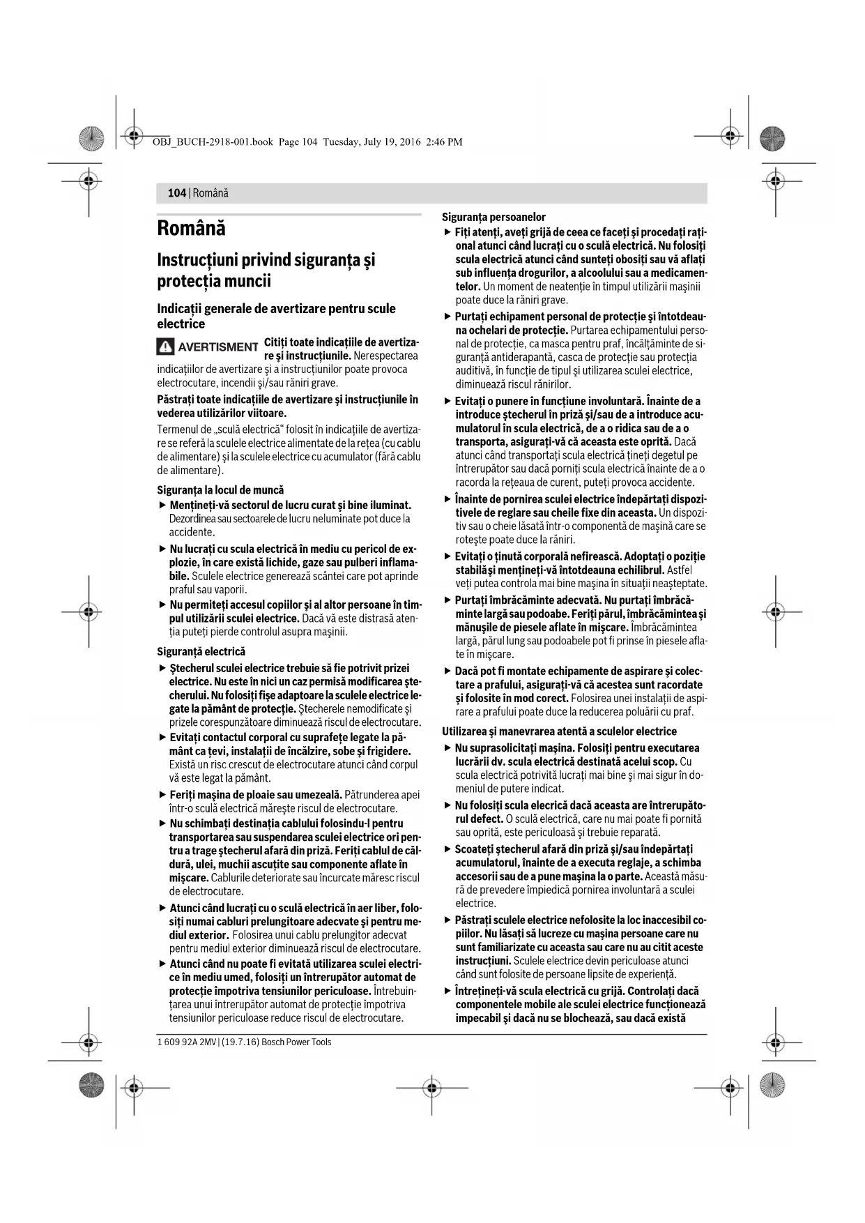 Электр құралдарды және аккумуляторларды/батарея- ларды үй қоқысына тастамаңыз! Тек қана ЕО елдері үшін: Еуропа 2012/19/EU ережесі бойынша жарамсыз электр құралдары және Еуропа 2006/66/EC ережесі бойынша зақымдал- ған немесе ескі аккумулятор/ батареялар бөлек жиналып кәдеге жаратылуы қажет. Аккумуляторлар/батареялар: Литий-иондық: “Тасымалдау” тарауындағы, 103 бетіндегі нұсқауларды орындаңыз. Техникалық өзгерістер енгізу құқығы сақталады. OBJ_BUCH-2918-001.book Page 103 Tuesday, July 19, 2016 2:46 PM104 | Română 1 609 92A 2MV | (19.7.16) Bosch Power Tools Română Instrucţiuni privind siguranţa şi protecţia muncii Indicaţii generale de avertizare pentru scule electrice Citiţi toate indicaţiile de avertiza- re şi instrucţiunile. Nerespectarea indicaţiilor de avertizare şi a instrucţiunilor poate provoca electrocutare, incendii şi/sau răniri grave. Păstraţi toate indicaţiile de avertizare şi instrucţiunile în vederea utilizărilor viitoare. Termenul de „sculă electrică“ folosit în indicaţiile de avertiza- re se referă la sculele electrice alimentate de la reţea (cu cablu de alimentare) şi la sculele electrice cu acumulator (fără cablu de alimentare). Siguranţa la locul de muncă Menţineţi-vă sectorul de lucru curat şi bine iluminat. Dezordinea sau sectoarele de lucru neluminate pot duce la accidente. Nu lucraţi cu scula electrică în mediu cu pericol de ex- plozie, în care există lichide, gaze sau pulberi inflama- bile. Sculele electrice generează scântei care pot aprinde praful sau vaporii. Nu permiteţi accesul copiilor şi al altor persoane în tim- pul utilizării sculei electrice. Dacă vă este distrasă aten- ţia puteţi pierde controlul asupra maşinii. Siguranţă electrică Ştecherul sculei electrice trebuie să fie potrivit prizei electrice. Nu este în nici un caz permisă modificarea şte- cherului. Nu folosiţi fişe adaptoare la sculele electrice le- gate la pământ de protecţie. Ştecherele nemodificate şi prizele corespunzătoare diminuează riscul de electrocutare. Evitaţi contactul corporal cu suprafeţe legate la pă- mânt ca ţevi, instalaţii de încălzire, sobe şi frigidere. Există un risc crescut de electrocutare atunci când corpul vă este legat la pământ. Feriţi maşina de ploaie sau umezeală. Pătrunderea apei într-o sculă electrică măreşte riscul de electrocutare. Nu schimbaţi destinaţia cablului folosindu-l pentru transportarea sau suspendarea sculei electrice ori pen- tru a trage ştecherul afară din priză. Feriţi cablul de căl- dură, ulei, muchii ascuţite sau componente aflate în mişcare. Cablurile deteriorate sau încurcate măresc riscul de electrocutare. Atunci când lucraţi cu o sculă electrică în aer liber, folo- siţi numai cabluri prelungitoare adecvate şi pentru me- diul exterior. Folosirea unui cablu prelungitor adecvat pentru mediul exterior diminuează riscul de electrocutare. Atunci când nu poate fi evitată utilizarea sculei electri- ce în mediu umed, folosiţi un întrerupător automat de protecţie împotriva tensiunilor periculoase. Întrebuin- ţarea unui întrerupător automat de protecţie împotriva tensiunilor periculoase reduce riscul de electrocutare. Siguranţa persoanelor Fiţi atenţi, aveţi grijă de ceea ce faceţi şi procedaţi raţi- onal atunci când lucraţi cu o sculă electrică. Nu folosiţi scula electrică atunci când sunteţi obosiţi sau vă aflaţi sub influenţa drogurilor, a alcoolului sau a medicamen- telor. Un moment de neatenţie în timpul utilizării maşinii poate duce la răniri grave. Purtaţi echipament personal de protecţie şi întotdeau- na ochelari de protecţie. Purtarea echipamentului perso- nal de protecţie, ca masca pentru praf, încălţăminte de si- guranţă antiderapantă, casca de protecţie sau protecţ