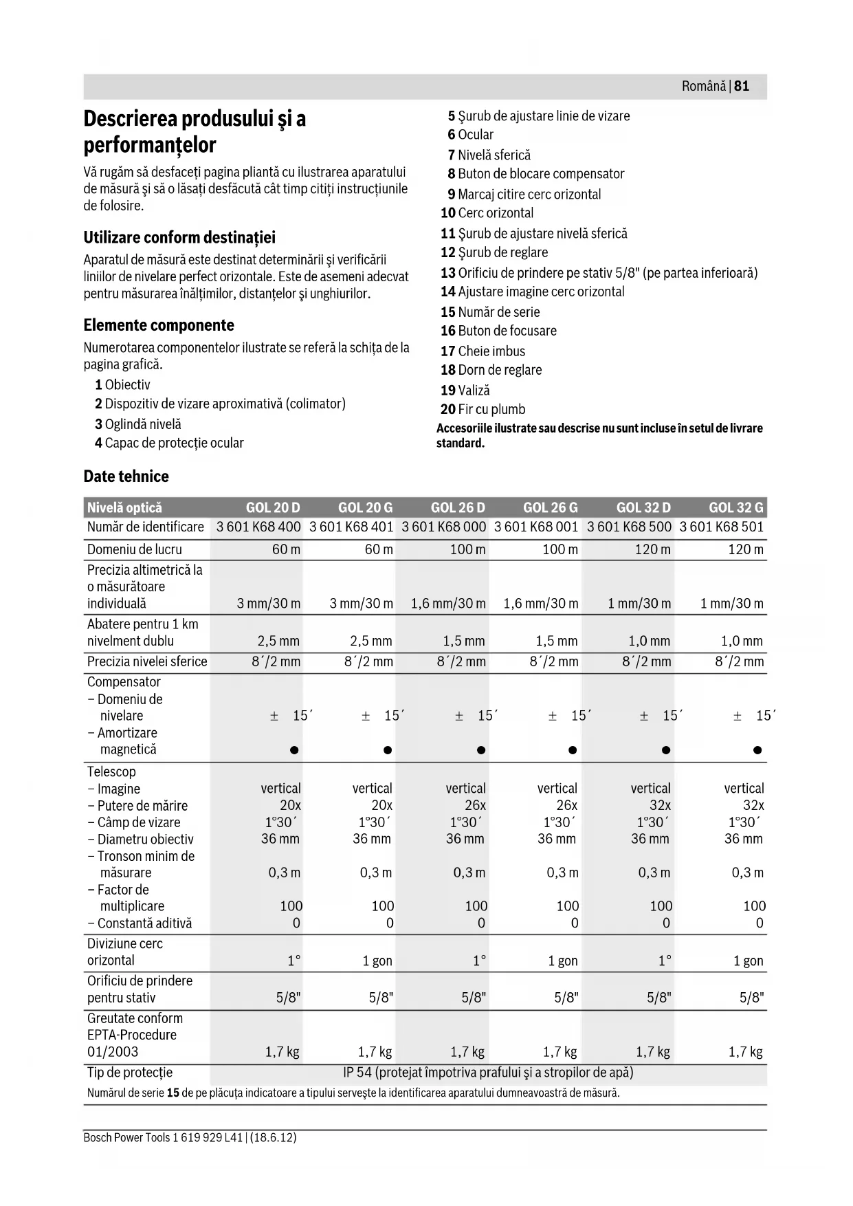 OBJ_BUCH-1239-002.book Page 80 Monday, June 18, 2012 10:51 AMRomână | 81 Bosch Power Tools 1 619 929 L41 | (18.6.12) Descrierea produsului şi a performanţelor Vă rugăm să desfaceţi pagina pliantă cu ilustrarea aparatului de măsură şi să o lăsaţi desfăcută cât timp citiţi instrucţiunile de folosire. Utilizare conform destinaţiei Aparatul de măsură este destinat determinării şi verificării liniilor de nivelare perfect orizontale. Este de asemeni adecvat pentru măsurarea înălţimilor, distanţelor şi unghiurilor. Elemente componente Numerotarea componentelor ilustrate se referă la schiţa de la pagina grafică. 1 Obiectiv 2 Dispozitiv de vizare aproximativă (colimator) 3 Oglindă nivelă 4 Capac de protecţie ocular 5 Şurub de ajustare linie de vizare 6 Ocular 7 Nivelă sferică 8 Buton de blocare compensator 9 Marcaj citire cerc orizontal 10 Cerc orizontal 11 Şurub de ajustare nivelă sferică 12 Şurub de reglare 13 Orificiu de prindere pe stativ 5/8" (pe partea inferioară) 14 Ajustare imagine cerc orizontal 15 Număr de serie 16 Buton de focusare 17 Cheie imbus 18 Dorn de reglare 19 Valiză 20 Fir cu plumb Accesoriile ilustrate sau descrise nu sunt incluse în setul de livrare standard. Date tehnice Nivelă optică GOL 20 D GOL 20 G GOL 26 D GOL 26 G GOL 32 D GOL 32 G Număr de identificare 3 601 K68 400 3 601 K68 401 3 601 K68 000 3 601 K68 001 3 601 K68 500 3 601 K68 501 Domeniu de lucru 60 m 60 m 100 m 100 m 120 m 120 m Precizia altimetrică la o măsurătoare individuală 3 mm/30 m 3 mm/30 m 1,6 mm/30 m 1,6 mm/30 m 1 mm/30 m 1 mm/30 m Abatere pentru 1 km nivelment dublu 2,5 mm 2,5 mm 1,5 mm 1,5 mm 1,0 mm 1,0 mm Precizia nivelei sferice 8´/2 mm 8´/2 mm 8´/2 mm 8´/2 mm 8´/2 mm 8´/2 mm Compensator – Domeniu de nivelare – Amortizare magnetică ± 15´