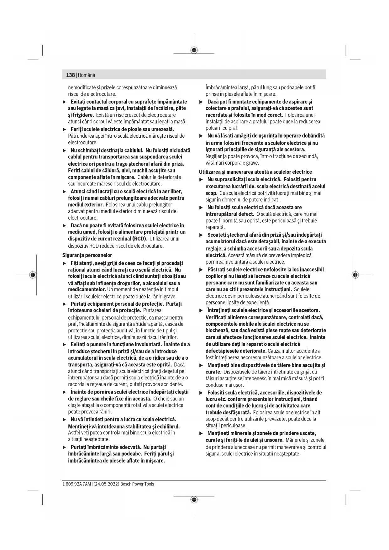 – электр құралына артық жүктеме түскеннен орын алған ақаулар. (Құралға артық жүктеме түсудің шартсыз белгілеріне мыналар жатады: құбылу түсінің пайда болуы немесе электр құралы бөліктері мен түйіндерінің деформациясы немесе қорытылуы, жоғары температура әсерінен электр қозғалтқышындағы сымдар оқшаулағышының қараюы немесе көмірленуі.) Кәдеге жарату Электр құралдар, жабдықтар және бумаларын айналаны қорғайтын кәдеге жаратуға апару қажет. Электр құралдарды үй қоқысына тастамаңыз! Тек қана ЕО елдері үшін: Электр және электрондық ескі құралдар бойынша Еуропа 2012/19/EU ережесі және ұлттық заңдарға сайкес пайдалануға жарамсыз электр құралдары бөлек жиналып, кәдеге жаратылуы қажет. Қате жолмен кәдеге жаратылған ескі электрлік және электрондық құрылғылар қауіпті заттардың болу мүмкіндігіне байланысты қоршаған ортаға және адам денсаулығына зиянды әсер тигізуі мүмкін. Română Instrucţiuni de siguranţă Instrucţiuni generale de siguranţă pentru scule electrice AVERTIS- MENT Citiţi toate avertizările, instrucţiunile, ilustraţiile şi specificaţiile puse la dispoziţie împreună cu această sculă electrică. Nerespectarea instrucţiunilor menţionate mai jos poate duce la electrocutare, incendiu şi/sau vătămări corporale grave. Păstraţi toate indicaţiile de avertizare şi instrucţiunile în vederea utilizărilor viitoare. Termenul "sculă electrică" folosit în indicaţiile de avertizare se referă la sculele electrice alimentate de la reţea (cu cablu de alimentare) sau la sculele electrice cu acumulator (fără cablu de alimentare). Siguranţa la locul de muncă u Menţineţi‑vă sectorul de lucru curat şi bine iluminat. Dezordinea sau sectoarele de lucru neluminate pot duce la accidente. u Nu lucraţi cu sculele electrice în mediu cu pericol de explozie, în care există lichide, gaze sau pulberi inflamabile. Sculele electrice generează scântei care pot aprinde praful sau vaporii. u Nu permiteţi accesul copiilor şi al spectatorilor în timpul utilizării sculei electrice. Dacă vă este distrasă atenţia puteţi pierde controlul. Siguranţă electrică u Ştecherul sculei electrice trebuie să fie potrivit prizei electrice. Nu modificaţi niciodată ştecherul. Nu folosiţi fişe adaptoare la sculele electrice cu împământare (legate la masă). Ştecherele Bosch Power Tools 1 609 92A 7AM | (24.05.2022)138 | Română nemodificate şi prizele corespunzătoare diminuează riscul de electrocutare. u Evitaţi contactul corporal cu suprafeţe împământate sau legate la masă ca ţevi, instalaţii de încălzire, plite şi frigidere. Există un risc crescut de electrocutare atunci când corpul vă este împământat sau legat la masă. u Feriţi sculele electrice de ploaie sau umezeală. Pătrunderea apei într‑o sculă electrică măreşte riscul de electrocutare. u Nu schimbaţi destinaţia cablului. Nu folosiţi niciodată cablul pentru transportarea sau suspendarea sculei electrice ori pentru a trage ştecherul afară din priză. Feriţi cablul de căldură, ulei, muchii ascuţite sau componente aflate în mişcare. Cablurile deteriorate sau încurcate măresc riscul de electrocutare. u Atunci când lucraţi cu o sculă electrică în aer liber, folosiţi numai cabluri prelungitoare adecvate pentru mediul exterior. Folosirea unui cablu prelungitor adecvat pentru mediul exterior diminuează riscul de electrocutare. u Dacă nu poate fi evitată folosirea sculei electrice în mediu umed, folosiţi o alimentare protejată printr-un dispozitiv de curent rezidual (RCD). Utilizarea unui dispozitiv RCD reduce riscul de electrocutare. Siguranţa persoanelor u Fiţi atenţi, aveţi grijă de ceea ce faceţi şi procedaţi raţional atunci când lucraţi cu o sculă electrică. Nu folosiţi scula electrică atunci când sunteţi obosiţi sau vă aflaţi sub influenţa drogurilor, a alcoolului sau a medicamentelor. Un moment de neatenţie în timpul utilizării sculelor electrice poate duce la răniri grave. u Purtaţi echipament personal de protecţie. Purtaţi întoteauna ochelari de protecţie. Purtarea echipamentului personal de protecţie, ca masca pentru praf, încălţăminte de siguranţă antiderapantă, casca de protecţie sau protecţia auditivă, în funcţie de tipul şi utilizarea sculei electrice, diminuează riscul rănirilor. u Evitaţi o punere în funcţiune involuntară. Înainte de a introduce ştecherul în priză şi/sau de a introduce acumulatorul în scula electrică, de a o ridica sau de a o transporta, asiguraţi‑vă că aceasta este oprită. Dacă atunci când transportaţi scula electrică ţineţi degetul pe întrerupător sau dacă porniţi scula electrică înainte de a o racorda la reţeaua de curent, puteţi provoca accidente. u Înainte de pornirea sculei electrice îndepărtaţi cleştii de reglare sau cheile fixe din aceasta. O cheie sau un cleşte ataşat la o componentă rotativă a sculei electrice poate provoca răniri. u Nu vă întindeţi pentru a lucra cu scula electrică. Menţineţi-vă întotdeauna stabilitatea şi echilibrul. Astfel veţi putea controla mai bine scula electrică în situaţii neaşteptate. u Purtaţi îmbrăcăminte adecvată. Nu purtaţi îmbrăcăminte largă sau podoabe. Feriţi p
