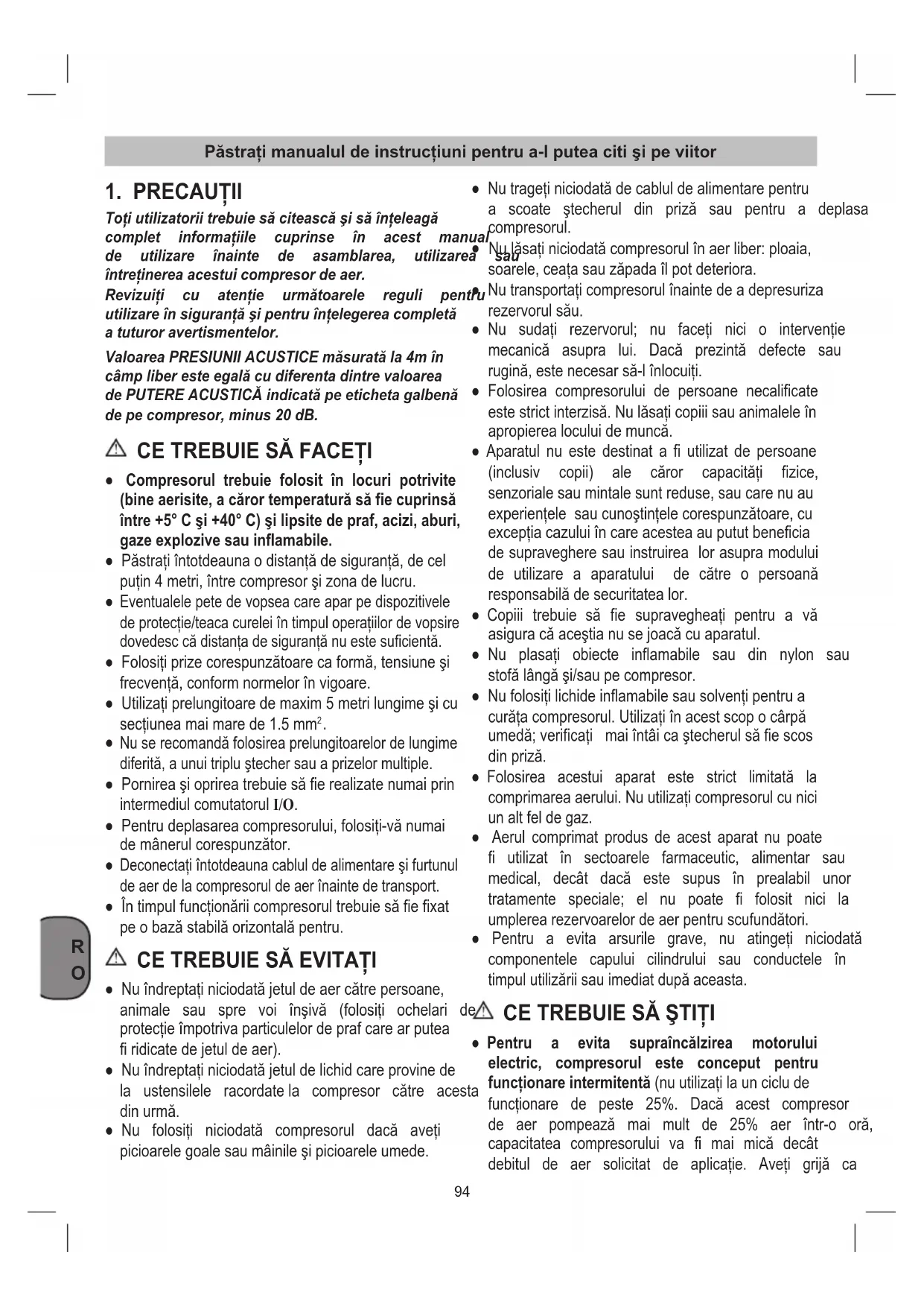 Toţiutilizatoriitrebuiesăciteascăşisăînţeleagă complet informaţiile cuprinse în acest manual de utilizare înainte de asamblarea, utilizarea sau întreţinereaacestuicompresordeaer. Revizuiţi cu atenţie următoarele reguli pentru utilizareînsiguranţăşipentruînţelegereacompletă a tuturor avertismentelor. ValoareaPRESIUNIIACUSTICEmăsuratăla4mîn câmpliberesteegalăcudiferentadintrevaloarea dePUTEREACUSTICĂindicatăpeetichetagalbenă de pe compresor, minus 20 dB.