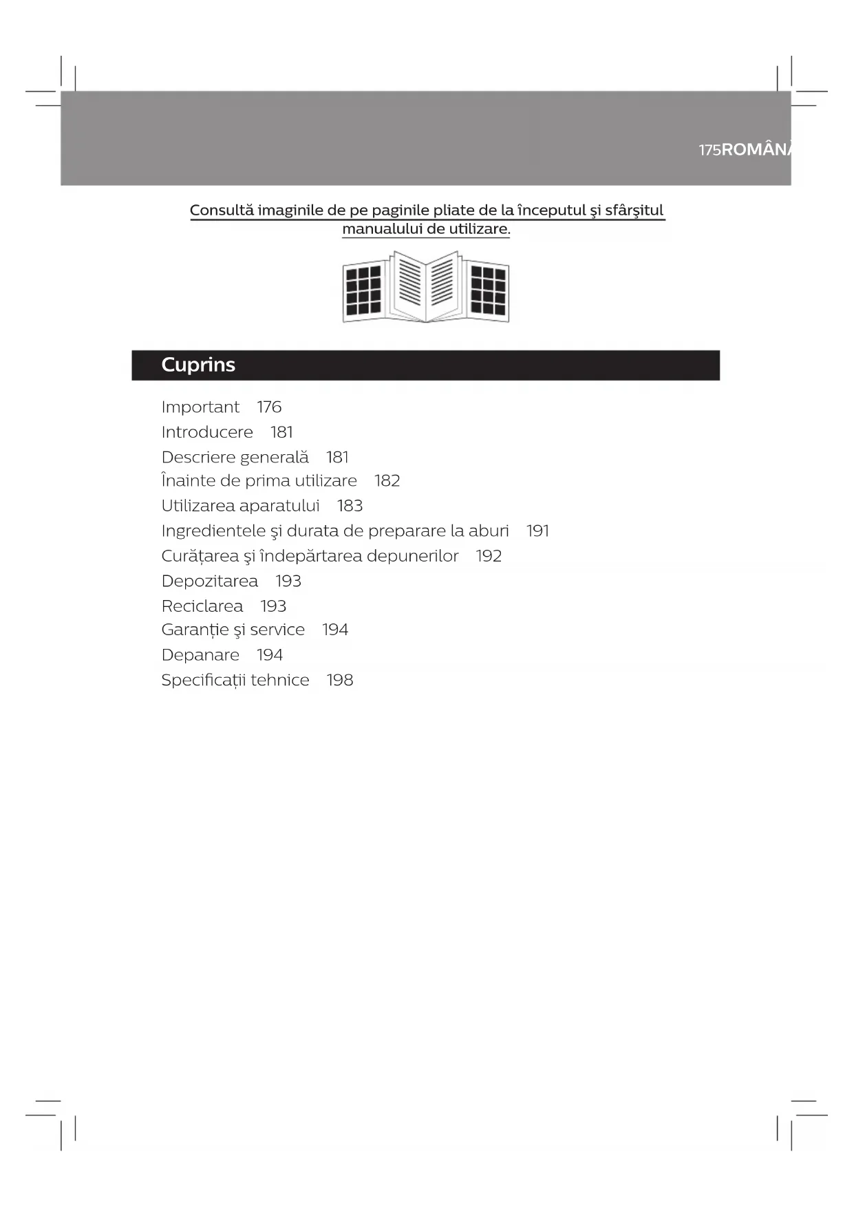 - Manevrează cu multă atenţie blocul tăietor. Marginile tăioase sunt foarte ascuţite. 7 Roteşte capacul rezervorului de apă în sens antiorar şi scoate-l de pe rezervorul de apă (Fig. ). 8 Spală capacul rezervorului de apă sub jet de apă. 9 Scurge apa în exces din rezervor. Dacă este necesar, toarnă apă proaspătă în rezervorul de apă (Fig. e) şi scurge-o (Fig. ‚). Repetă după cum este necesar, până când rezervorul de apă este curat.193ROMÂNĂ 10 Imediat după utilizare, curăţă cu apă erbinte şi detergent toate celelalte componente care intră în contact cu alimentele. 11 După spălare, usucă unitatea principală şi toate componentele. Detartrarea rezervorului de apă Pentru o funcţionare ideală, recomandăm să se efectueze detartrarea aparatului o dată la 4 săptămâni. Pentru a reduce depunerile de calcar, recomandăm utilizarea apei dedurizate sau puricate pentru preparare la aburi, reîncălzire sau dezgheţare. Pentru a detartra aparatul, urmează instrucţiunile de detartrare de mai jos. 1 Asiguraţi-vă că aparatul este oprit. 2 Pentru a detartra rezervorul de apă, amestecă 80 ml de oţet alb (acid acetic 6%) cu 80 ml de apă - sau poţi utiliza acid citric cu apă caldă. 3 Pune soluţia la erbătorul din rezervorul de apă. 4 Pune capacul pe rezervorul de apă şi roteşte-l în sens orar pentru a-l bloca bine în poziţie. 5 Aşteaptă timp de 6 ore/toată noaptea sau până când calcarul se dizolvă. 6 Scurge din rezervorul de apă soluţia utilizată (Fig. ‚). 7 Dacă depunerea de calcar nu s-a dizolvat complet, repetă ciclul de detartrare de la pasul 1 la pasul 6 din acest capitol. 8 Toarnă apă proaspătă în rezervorul de apă (Fig. e) şi scurge-o (Fig. ‚). Repetă după cum este necesar, până când rezervorul de apă este curat. 9 Clăteşte capacul rezervorului de apă sub jet de apă. 10 Umple rezervorul de apă cu 200 ml de apă şi lasă aparatul să efectueze un ciclu de preparare la aburi de 20 de minute cu bolul gol, înainte de a folosi din nou aparatul cu ingrediente. Depozitarea 1 Goleşte rezervorul de apă înainte de a depozita aparatul (Fig. ‚). 2 Înainte de a depozita aparatul, asigură-te că toate componentele sunt curate şi uscate (consultă capitolul „Curăţarea şi detartrarea”). 3 Depozitează aparatul cu blocul tăietor în bol, pentru a împiedica deteriorarea. 4 Asigură-te întotdeauna că atât capacul rezervorului de apă, cât şi cel al bolului sunt blocate corect în poziţie pentru depozitare. Reciclarea Acest simbol înseamnă că acest produs nu poate eliminat împreună cu gunoiul menajer normal (2012/19/UE). Urmează regulile din ţara ta pentru colectarea separată a produselor electrice şi electronice. Eliminarea corectă ajută la prevenirea consecinţelor negative asupra mediului şi sănătăţii umane.194 ROMÂNĂ Garanţie şi service Dacă ai nevoie de informaţii sau dacă întâmpini probleme, vizitează pagina de internet Philips la www. philips. com / avent sau contactează Centrul Philips de asistenţă pentru clienţi din ţara în care locuieşti (pentru detalii, consultă broşura de garanţie internaţională). Dacă în ţara dvs. nu există niciun centru de asistenţă pentru clienţi, contactaţi distribuitorul Philips local. Depanare Acest capitol descrie cele mai frecvente probleme pe care le puteţi avea la utilizarea aparatului. Dacă nu puteţi rezolva problema cu ajutorul informaţiilor de mai jos, contactaţi Centrul de asistenţă clienţi din ţara dvs. Problemă Cauză posibilă Soluţie Aparatul nu funcţionează. Acest aparat este echipat cu un dispozitiv de blocare de siguranţă. Acest aparat nu funcţionează când componentele nu sunt montate corect pe unitatea principală. Montează corect toate componentele. Înainte de prepararea la aburi, bolul trebuie poziţionat vertical pe unitatea principală, cu capacul bolului în partea de jos; înainte de amestecare, pune bolul pe unitatea principală cu capacul în partea de sus şi blochează bolul rotindu-l în sens orar. Indicatorul luminos de preparare la aburi nu se aprinde. Aparatul nu este conectat la sursa de alimentare. Introdu ştecherul în priză. Bolul nu este poziţionat corect pe unitatea principală. Poziţionează bolul corect pe unitatea principală, cu capacul bolului în partea de jos. Ai început un alt ciclu de preparare la aburi imediat după nalizarea celui anterior. Opreşte aparatul şi lasă-l să se răcească timp de 10 minute înainte de a începe un alt ciclu de preparare la aburi. Butonul de comandă nu a fost rotit în poziţia oprit (OFF) după nalizarea ciclului anterior de preparare la aburi. Mai întâi roteşte butonul de comandă în poziţia oprit (OFF), apoi roteşte-l din nou pentru a selecta durata de funcţionare.195ROMÂNĂ Problemă Cauză posibilă Soluţie Rezervorul de apă emană un miros neplăcut la primele utilizări. Nu ai spălat în prealabil rezervorul de apă înainte de utilizare. Consultă capitolul „Curăţarea şi detartrarea” pentru a curăţa rezervorul de apă, apoi efectuează un ciclu de preparare la aburi cu bolul gol. Aparatul nu generează aburi. Nu ai pus apă în rezervorul de apă. Opreşte şi scoate din priză aparatul, apoi adaugă apă în rezervorul de apă. În rezervorul de apă sunt prea multe depuneri de calcar. Detartrează rezervorul de apă. Consultă secţiunea „Detartrarea” din capitolul „Curăţarea şi detartrarea”. Din rezervorul de apă ies aburi. Capacul rezervorului de apă nu este închis corect. Închide corect capacul rezervorului de apă. Asigură-te că pictograma de pe capacul rezervorului de apă este aliniată cu pictograma de pe rezervorul de apă. Bolul nu este montat corect pe unitatea principală. Poziţionează corect bolul pe unitatea principală. Ieşirea pentru aburi de pe capacul rezervorului de apă este blocată cu impurităţi sau cu depuneri de calcar. Curăţă ie