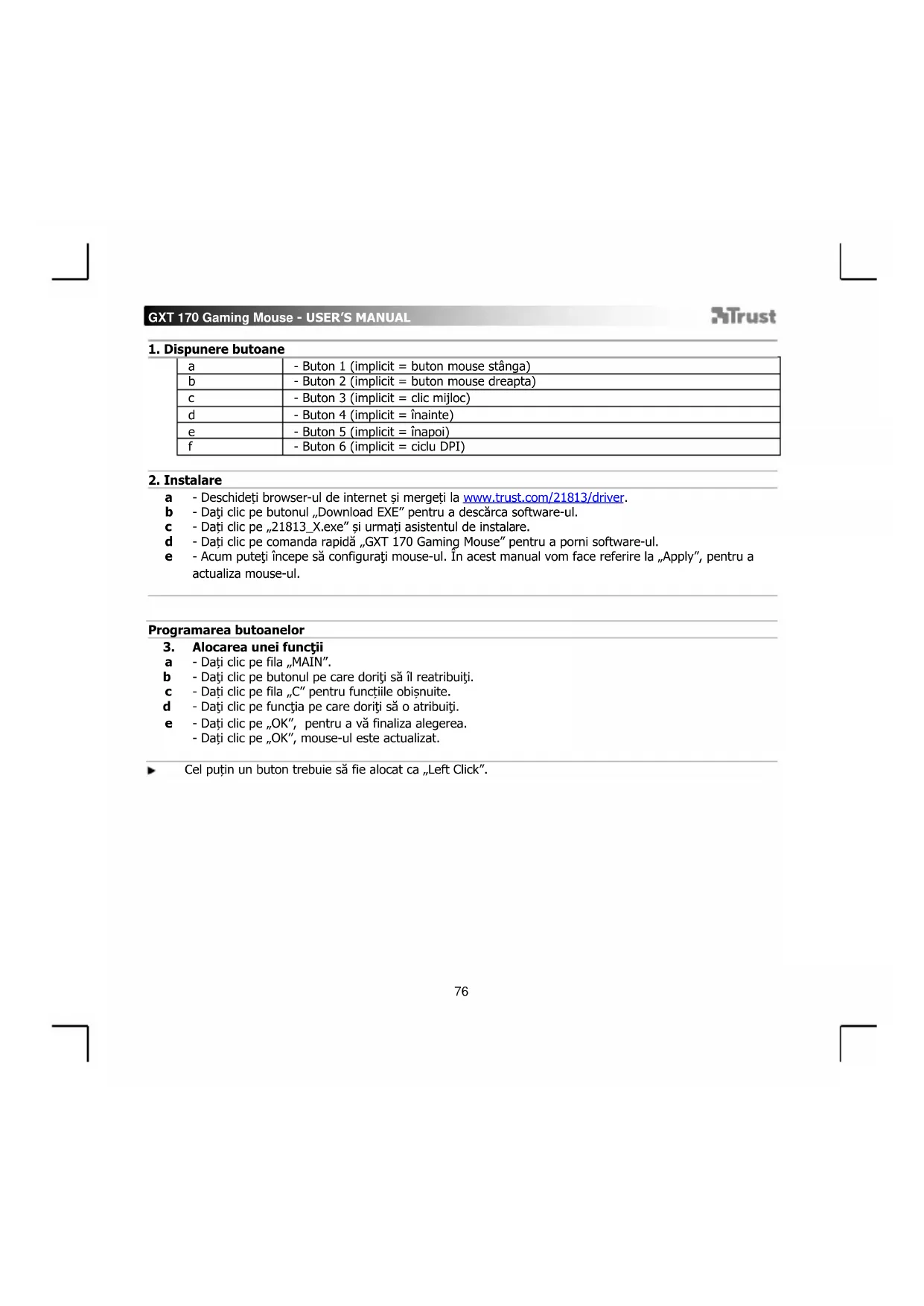 - Deschideți browser-ul de internet și mergeți la www.trust.com/21813/driver. - Daţi clic pe butonul „Download EXE” pentru a descărca software-ul. - Dați clic pe „21813_X.exe” și urmați asistentul de instalare. - Dați clic pe comanda rapidă „GXT 170 Gaming Mouse” pentru a porni software-ul. - Acum puteţi începe să configuraţi mouse-ul. În acest manual vom face referire la „Apply”, pentru a actualiza mouse-ul.