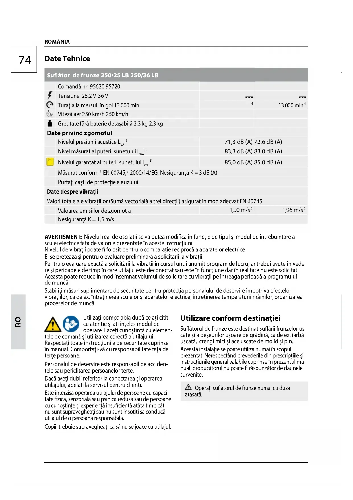 tate zică, senzorială sau psihică redusă sau de persoane cu cunoștin țe și experiență insucientă atâta timp cât nu sunt supravegheați sau nu sunt însoțiți să conducă utilajul de o persoană responsabilă. Copiii trebuie supravegheați ca să nu se joace cu utilajul. Utilizare conform destinaţiei Suătorul de frunze este destinat suării frunzelor us- cate și a deșeurilor ușoare de grădină, ca de ex. iarbă uscată, crengi mici și ace uscate de molid și pin. Această instalaţie se poate utiliza numai în scopul prezentat. Nerespectând prevederile din prescripţiile şi instrucţiunile general valabile cuprinse în prezentul ma- nual, producătorul nu poate răspunzător de daunele sur venite. Operați suătorul de frunze numai cu duza atașată. Date Tehnice Suător de frunze 250/25 LB 250/36 LB Comandă nr. 95620 95720 Tensiune 25,2 V 36 V min Turaţia la mersul în gol 13.000 min