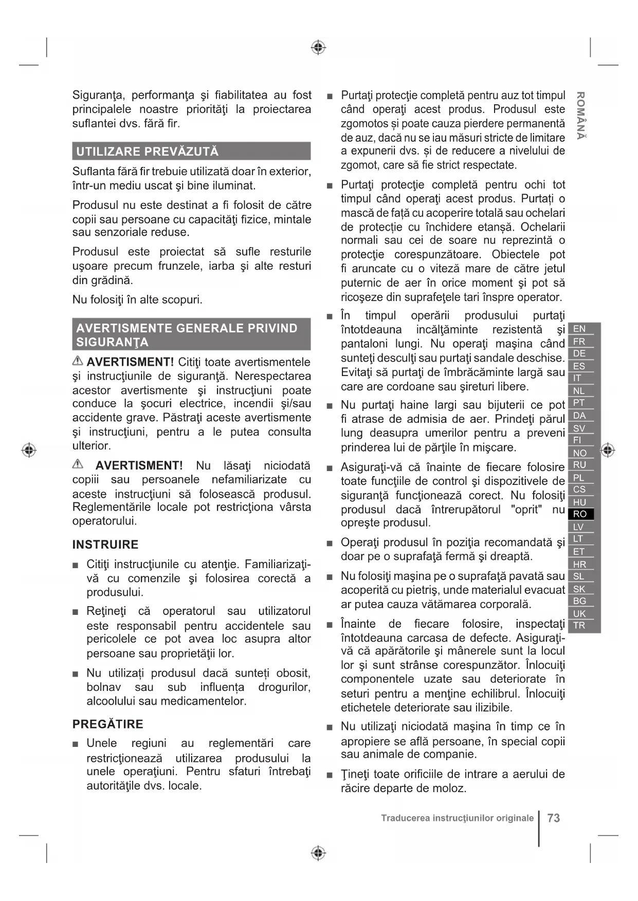 Sufl anta fără fi r trebuie utilizată doar în exterior, într-un mediu uscat şi bine iluminat. Produsul nu este destinat a fi folosit de către copii sau persoane cu capacităţi fi zice, mintale sau senzoriale reduse. Produsul este proiectat să sufl e resturile uşoare precum frunzele, iarba şi alte resturi din grădină. Nu folosiţi în alte scopuri.