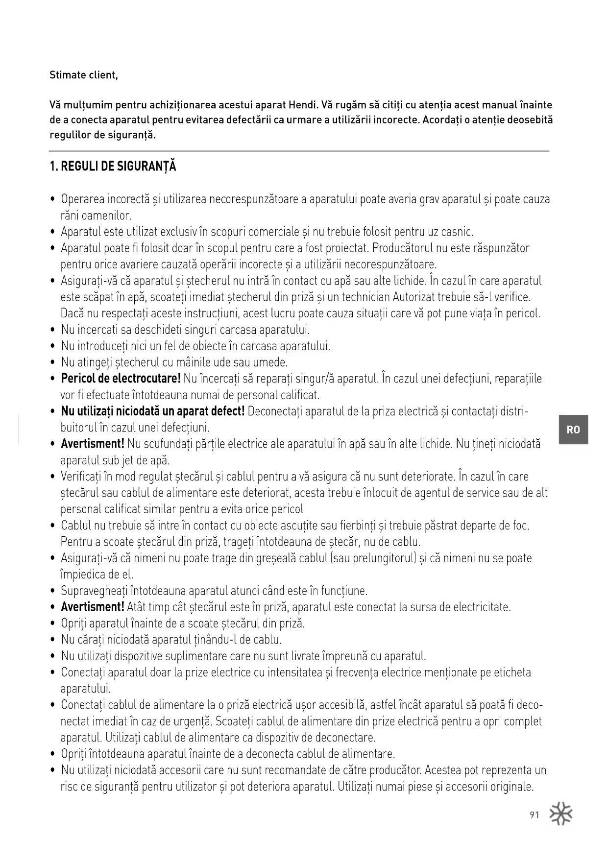 Stimate client, Vă mulțumim pentru achiziționarea acestui aparat Hendi. Vă rugăm să citiți cu atenția acest manual înainte de a conecta aparatul pentru evitarea defectării ca urmare a utilizării incorecte. Acordați o atenție deosebită regulilor de siguranță.