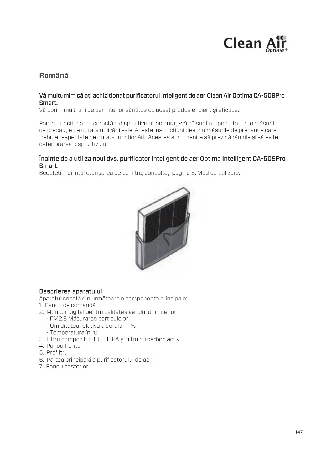 Vă multuim că ați achizitionat purificatorul intelligent de aer Clean Air Optima CA-509Pro Smart.