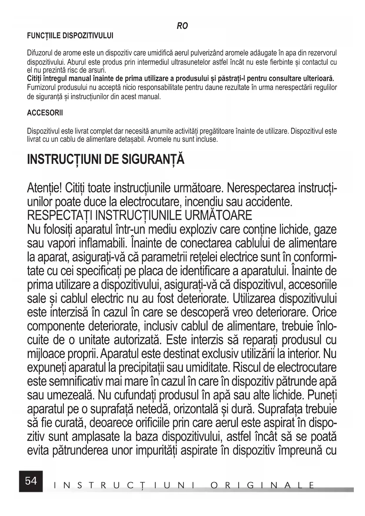 Difuzorul de arome este un dispozitiv care umidifi că aerul pulverizând aromele adăugate în apa din rezervorul dispozitivului. Aburul este produs prin intermediul ultrasunetelor astfel încât nu este fi erbinte și contactul cu el nu prezintă risc de arsuri. Citiți întregul manual înainte de prima utilizare a produsului și păstrați-l pentru consultare ulterioară. Furnizorul produsului nu acceptă nicio responsabilitate pentru daune rezultate în urma nerespectării regulilor de siguranță și instrucțiunilor din acest manual. ACCESORII Dispozitivul este livrat complet dar necesită anumite activități pregătitoare înainte de utilizare. Dispozitivul este livrat cu un cablu de alimentare detașabil. Aromele nu sunt incluse.