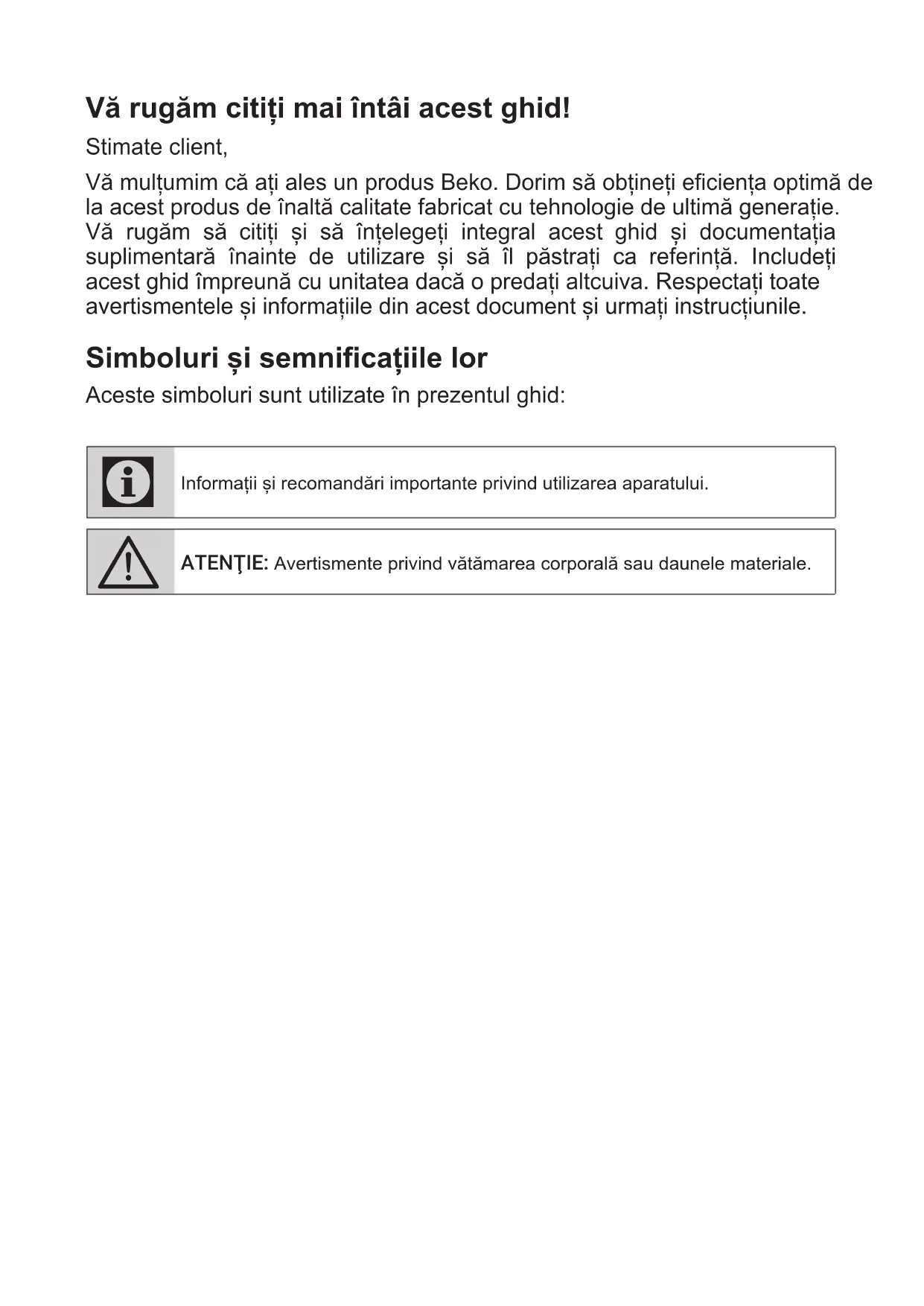 Niniejsze warunki gwarancji mają zastosowanie do Urządzeń zakupionych od dnia 01.03.2021 r. Gwarant oświadcza, że niniejsza Gwarancja jest udzielana Użytkownikowi dodatkowo i nie wyłącza, nie ogranicza ani nie zawiesza uprawnień Użytkownika wynikających z przepisów o rękojmi za wady rzeczy sprzedanej na podstawie Kodeksu cywilnego.Vă rugăm citiți mai întâi acest ghid! Stimate client, Vă mulțumim că ați ales un produs Beko. Dorim să obțineți eficiența optimă de la acest produs de înaltă calitate fabricat cu tehnologie de ultimă generație. Vă rugăm să citiți și să înțelegeți integral acest ghid și documentația suplimentară înainte de utilizare și să îl păstrați ca referință. Includeți acest ghid împreună cu unitatea dacă o predați altcuiva. Respectați toate avertismentele și informațiile din acest document și urmați instrucțiunile. Simboluri și semnificațiile lor Aceste simboluri sunt utilizate în prezentul ghid:
