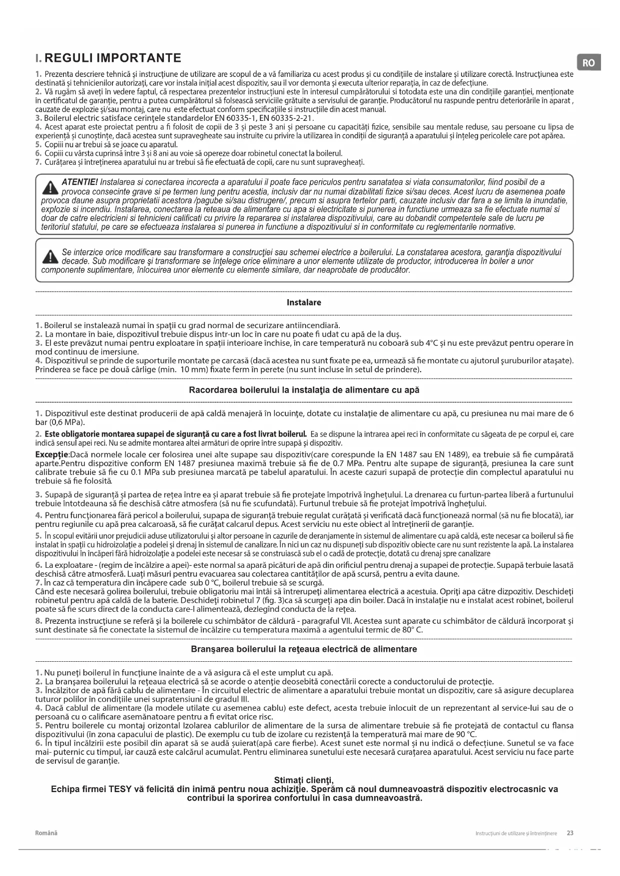 2. La branşarea boilerului la reţeaua electrică să se acorde o atenţie deosebită conectării corecte a conductorului de protecţie. 3. Încălzitor de apă fără cablu de alimentare - În circuitul electric de alimentare a aparatului trebuie montat un dispozitiv, care să asigure decuplarea tuturor polilor în condiţiile unei supratensiuni de gradul III. 4. Dacă cablul de alimentare (la modele utilate cu asemenea cablu) este defect, acesta trebuie înlocuit de un reprezentant al service-lui sau de o persoană cu o calicare asemănatoare pentru a evitat orice risc. 5. Pentru boilerele cu montaj orizontal Izolarea cablurilor de alimentare de la sursa de alimentare trebuie să fie protejată de contactul cu flansa dispozitivului (în zona capacului de plastic). De exemplu cu tub de izolare cu rezistenţă la temperatură mai mare de 90 °C. 6. În tipul încălzirii este posibil din aparat să se audă șuierat(apă care erbe). Acest sunet este normal și nu indică o defecțiune. Sunetul se va face mai- puternic cu timpul, iar cauză este calcărul acumulat. Pentru eliminarea sunetului este necesară curațarea aparatului. Acest serviciu nu face parte de servisul de garanție. Stimaţi clienţi, Echipa rmei TESY vă felicită din inimă pentru noua achiziţie. Sperăm că noul dumneavoastră dispozitiv electrocasnic va contribui la sporirea confortului în casa dumneavoastră.24 Instrucțiuni de utilizare și întreinținere