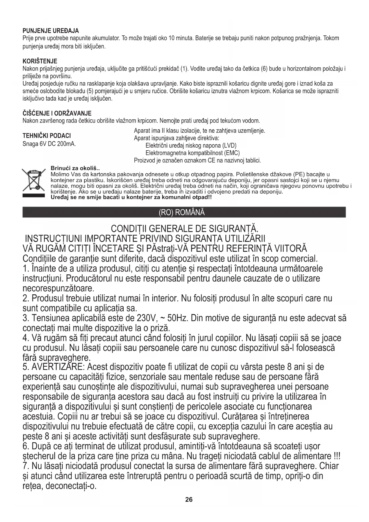 Înainte de prima utilizare, încărcați bateria. Poate dura aproximativ 10 ore. Bateriile ar trebui să fie reîncărcate atunci când sunt complet epuizate. În timpul încărcării, dispozitivul trebuie să fie oprit. UTILIZARE După încărcarea dispozitivului, porniți-l mai devreme apăsând butonul (1). Dispun dispozitivul de acționare, astfel încât peria (6) să fie într-o poziție orizontală și aderenta la substrat. Dispozitivul are un mâner mobil care permite o manevră mai bună. Pentru a arunca conținutul coșului, ridicați dispozitivul în sus și peste gunoi. Eliberați încuietorul (5) glisând-o spre mâner. Ștergeți interiorul coșului cu o cârpă umedă. Coșul de gunoi trebuie golit numai la închiderea mașinii. CURATENIE SI MENTENANTA: După utilizare, ștergeți peria cu o cârpă umedă. Nu vă spălați sub apă curentă. SPECIFICAȚII: Curent de incarcare: 6V DC 200mA. Din grija pentru mediul înconjurător. Ambalajele din carton vă rugăm să le transmiteţi şa centrele de maculatură. Sacii din polietilenă (PE) trebuie aruncate în recipientele pentru materialele plastice. Dispozitivul uzat trebuie transmis la punctul corespunzător de depozitare, deoarece componentele periculoase care se găsesc în dispozitiv pot fi foarte periculoase pentru mediul înconjurător. Dispozitivul electric trebuie transmis în aşa fel încât să se limiteze utilizarea lui repetată. Dacă în dispozitiv se găsesc baterii acestea trebuiesc scoase şi transmise către punctul de depozitare a acestora, separat. (HR) HRVATSKI OPĆI UVJETI SIGURNOSTI.