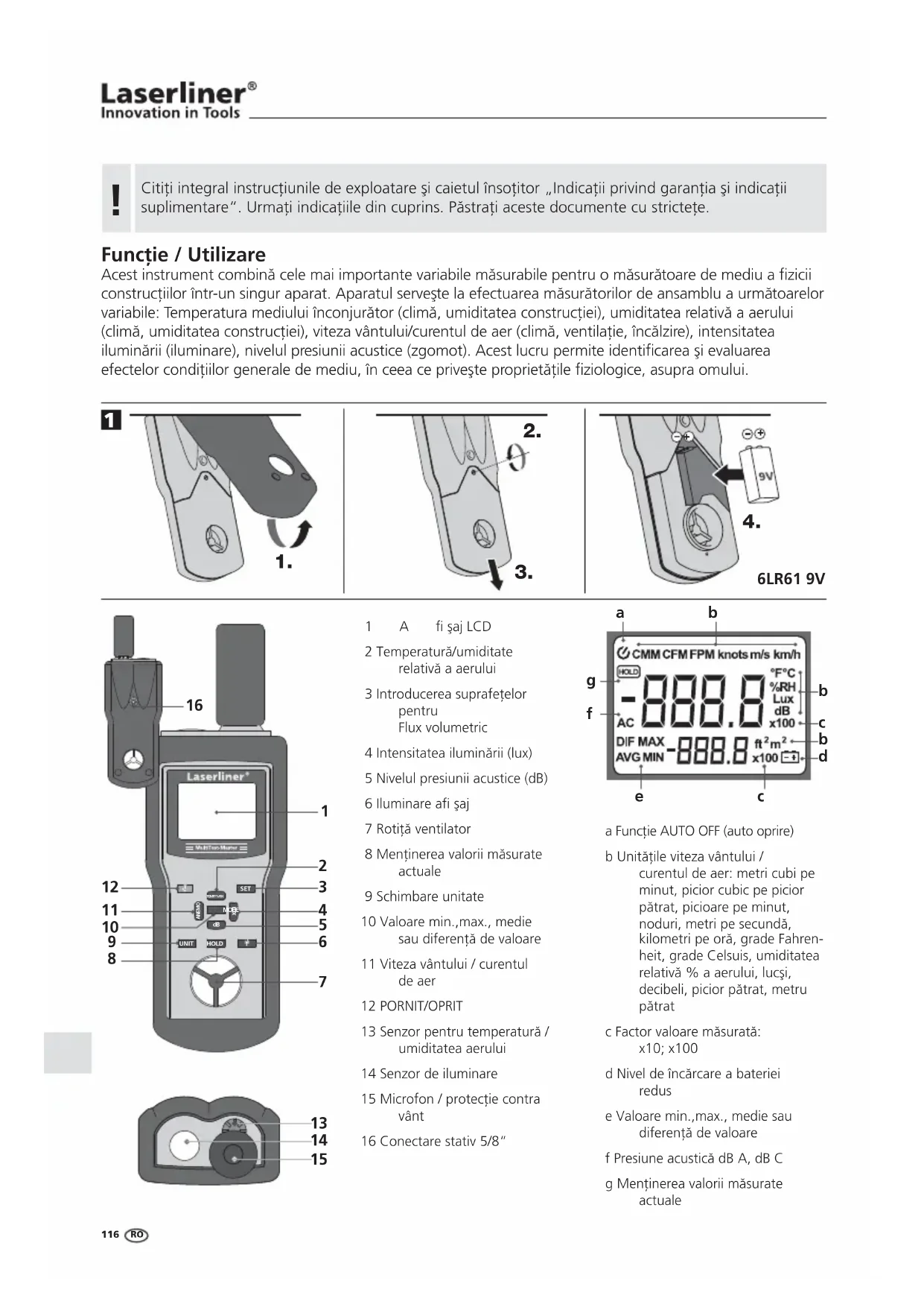 1AÖ ŭaj LCD 2 Temperaturń/umiditate relativń a aerului 3 Introducerea suprafeŰelor pentru Flux volumetric 4 Intensitatea iluminńrii (lux) 5 Nivelul presiunii acustice (dB) 6 Iluminare aÖ ŭaj 7 RotiŰń ventilator 8 MenŰinerea valorii mńsurate actuale 9 Schimbare unitate 10 Valoare min.,max., medie sau diferenŰń de valoare 11 Viteza vântului / curentul de aer 12 PORNIT/OPRIT 13 Senzor pentru temperaturń / umiditatea aerului 14 Senzor de iluminare 15 Microfon / protecŰie contra vânt 16 Conectare stativ 5/8“ a FuncŰie AUTO OFF (auto oprire) b UnitńŰile viteza vântului / curentul de aer: metri cubi pe minut, picior cubic pe picior pńtrat, picioare pe minut, noduri, metri pe secundń, kilometri pe orń, grade Fahren- heit, grade Celsuis, umiditatea relativń % a aerului, lucŭi, decibeli, picior pńtrat, metru pńtrat c Factor valoare mńsuratń: x10; x100 d Nivel de încńrcare a bateriei redus e Valoare min.,max., medie sau diferenŰń de valoare f Presiune acusticń dB A, dB C g MenŰinerea valorii mńsurate actuale