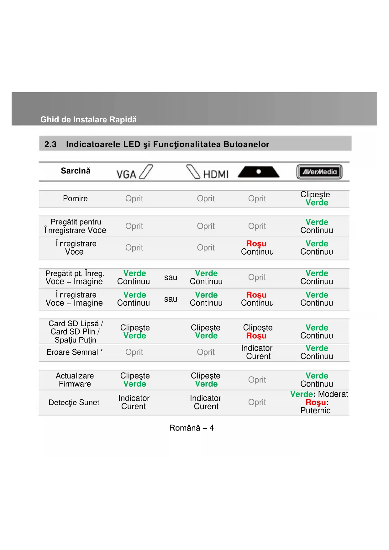 Din Spate Din Lateral Pentru sistemele de calcul fără port HDMI, folosiţi un cablu sau adaptor DVI-to-HDMI. Conectaţi PC-ul la dispozitiv (Intrare Audio) folosind cablul audio 3.5mm. Selectaţi modul “Duplicat” mode pe PC pentru a înregistra imaginea. Pentru mai multe informaţii, consultaţi rubrica FAQ de pe www.avermedia.com Nu deconectaţi alimentarea sau cardul SD în timpul înregistrării.Ghid de Instalare Rapidă