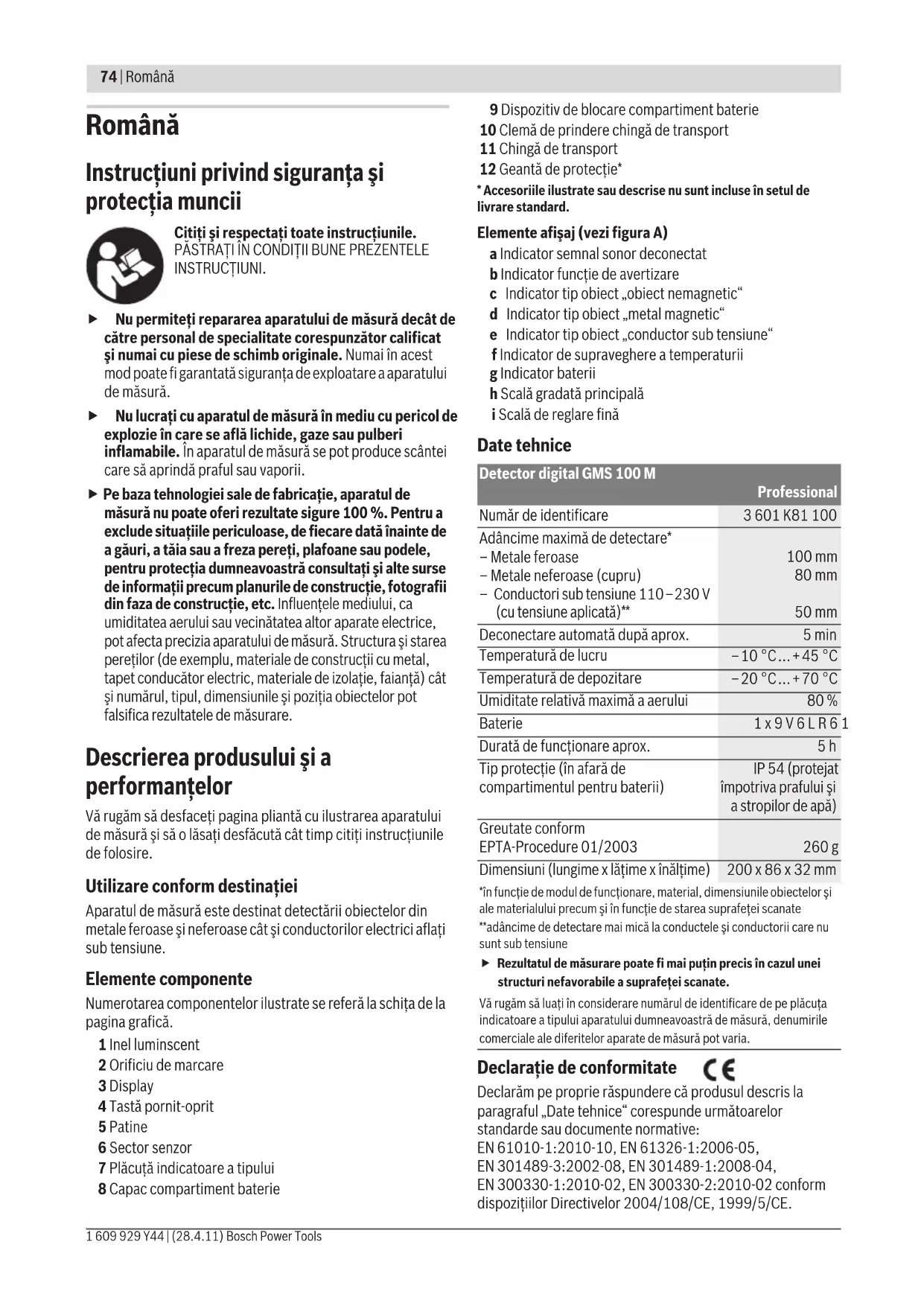 - Accesoriile ilustrate sau descrise nu sunt incluse în setul de livrare standard. Elemente afişaj (vezi figura A) a Indicator semnal sonor deconectat b Indicator funcţie de avertizare c Indicator tip obiect „obiect nemagnetic“ d Indicator tip obiect „metal magnetic“ e Indicator tip obiect „conductor sub tensiune“ f Indicator de supraveghere a temperaturii g Indicator baterii h Scală gradată principală i Scală de reglare fină Date tehnice Declaraţie de conformitate Declarăm pe proprie răspundere că produsul descris la paragraful „Date tehnice“ corespunde următoarelor standarde sau documente normative: EN 61010-1:2010-10, EN 61326-1:2006-05, EN 301489-3:2002-08, EN 301489-1:2008-04, EN 300330-1:2010-02, EN 300330-2:2010-02 conform dispoziţiilor Directivelor 2004/108/CE, 1999/5/CE. Detector digital GMS 100 M Professional Număr de identificare 3 601 K81 100 Adâncime maximă de detectare* – Metale feroase – Metale neferoase (cupru) – Conductori sub tensiune 110–230 V (cu tensiune aplicată)** 100 mm 80 mm 50 mm Deconectare automată după aprox. 5min Temperatură de lucru –10 °C...+45 °C Temperatură de depozitare –20 °C...+70 °C Umiditate relativă maximă a aerului 80 % Baterie 1x9V6LR61 Durată de funcţionare aprox.