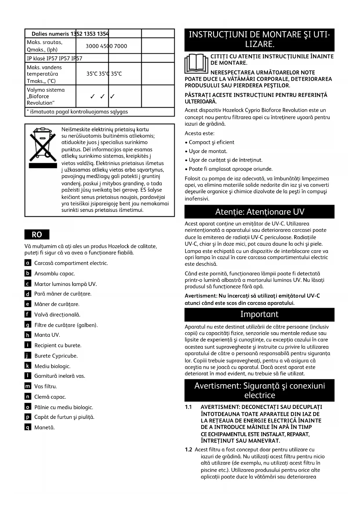 - Produsul a fost returnat intact. Restituirea contravalorii poate fi autorizată numai de către Hozelock Cyprio şi se face numai în locaţia de cumpărare la valoarea preţului de achiziţie a filtrului. Vă rugăm să reţineţi faptul că Garanţia Clearwater nu acoperă pierderea limpezimii apei, atunci când cauza o constituie algele filamentoase, spre deosebire de cele în suspensie (apă verde). Garanţie Hozelock Cyprio pentru 2 ani Dacă această unitate Bioforce Revolution (excl. lampa) devine inutilizabilă în termen de 2 ani de la data cumpărării, aceasta va fi reparată sau înlocuită, la alegerea noastră, gratuit, cu excepţia cazului în care, conform evaluării noastre, aceasta a fost deteriorată. Nu se acceptă nicio răspundere pentru daune cauzate de accidente, montarea sau utilizarea incorecte. Răspunderea este limitată la înlocuirea unităţii defecte. Această garanţie nu este transferabilă. Aceasta nu afectează drepturile dvs. statutare. Pentru a beneficia de această garanţie, contactaţi în primul rând serviciul pentru clienţi al Hozelock Cyprio (0121 313 1122) care poate cere ca unitatea să fie trimisă împreună cu dovada achiziţionării direct la adresa de mai jos. Contact / Piese de schimb www.hozelock.com Informaţii tehnice Număr piesă 1352 1353 1354 Gamă Bioforce Revolution Volţi (V) 230V 50Hz Alimentare UVC (W)