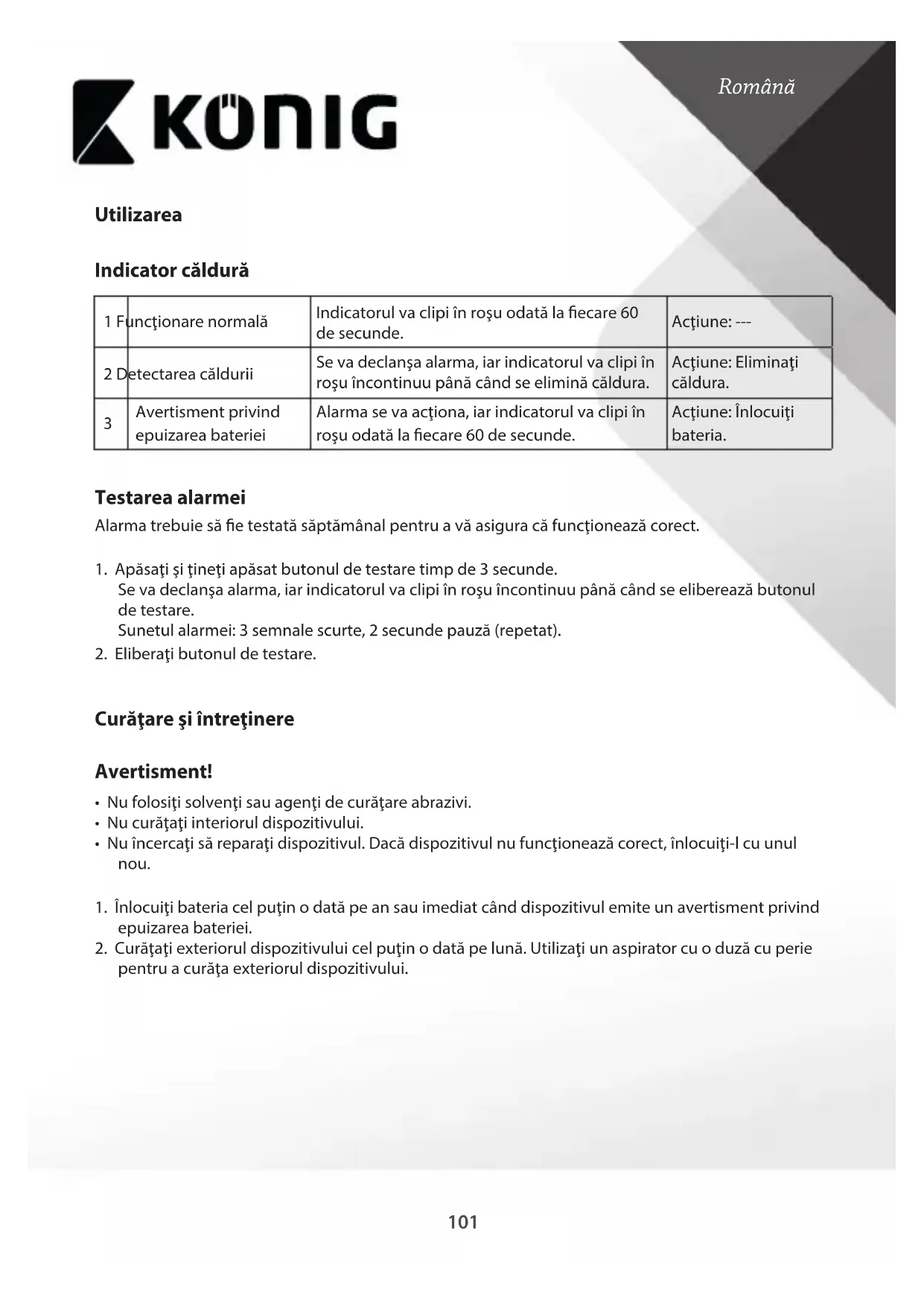 - Nu vopsiţi dispozitivul. Zonă Da Nu Living X Sufragerie X Bucătărie X Baie/toaletă X Dormitor X Hol X Mansardă X Subsol X Garaj X Camera cu centrala termică X100 Română min.10 cm min.10 cm max. 30 cm 122 cm 90 cm 90 cm 5 mm101 Română Utilizarea Indicator căldură 1 Funcţionare normală Indicatorul va clipi în roşu odată la ecare 60 de secunde. Acţiune: --- 2 Detectarea căldurii Se va declanşa alarma, iar indicatorul va clipi în roşu încontinuu până când se elimină căldura. Acţiune: Eliminaţi căldura.