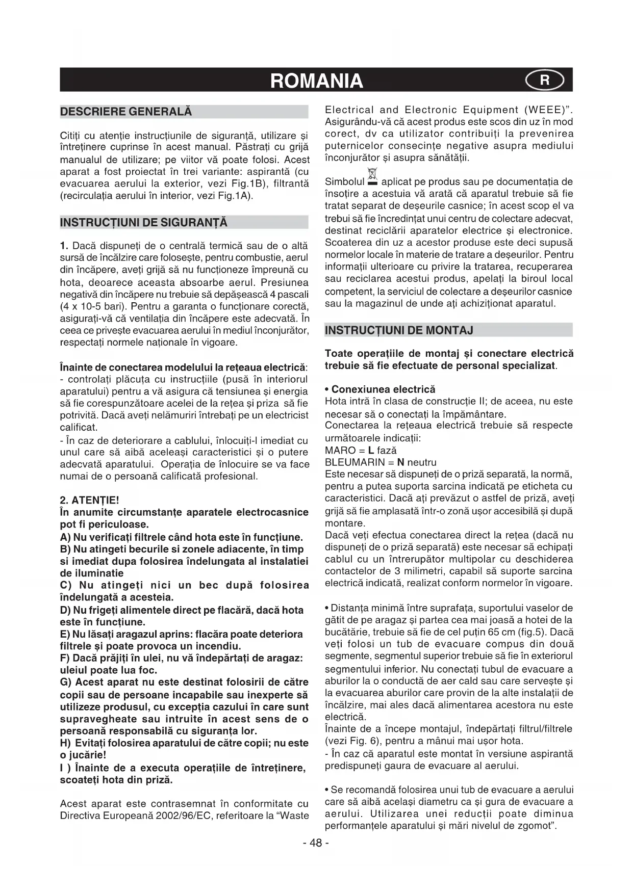 În anumite circumstanţe aparatele electrocasnice pot fi periculoase. A) Nu verificaţi filtrele când hota este în funcţiune. B) Nu atingeti becurile si zonele adiacente, în timp si imediat dupa folosirea îndelungata al instalatiei de iluminatie C) Nu atingeţi nici un bec după folosirea îndelungată a acesteia. D) Nu frigeţi alimentele direct pe flacără, dacă hota este în funcţiune. E) Nu lăsaţi aragazul aprins: flacăra poate deteriora filtrele și poate provoca un incendiu. F) Dacă prăjiţi în ulei, nu vă îndepărtaţi de aragaz: uleiul poate lua foc. G) Acest aparat nu este destinat folosirii de către copii sau de persoane incapabile sau inexperte să utilizeze produsul, cu excepţia cazului în care sunt supravegheate sau intruite în acest sens de o persoană responsabilă cu siguranţa lor. H) Evitaţi folosirea aparatului de către copii; nu este o jucărie! I ) Înainte de a executa operaţiile de întreţinere, scoateţi hota din priză. Acest aparat este contrasemnat în conformitate cu Directiva Europeană 2002/96/EC, referitoare la “Waste Electrical and Electronic Equipment (WEEE)”. Asigurându-vă că acest produs este scos din uz în mod corect, dv ca utilizator contribuiţi la prevenirea puternicelor consecinţe negative asupra mediului înconjurător și asupra sănătăţii. Simbolul aplicat pe produs sau pe documentaţia de însoţire a acestuia vă arată că aparatul trebuie să fie tratat separat de deșeurile casnice; în acest scop el va trebui să fie încredinţat unui centru de colectare adecvat, destinat reciclării aparatelor electrice și electronice. Scoaterea din uz a acestor produse este deci supusă normelor locale în materie de tratare a deșeurilor. Pentru informaţii ulterioare cu privire la tratarea, recuperarea sau reciclarea acestui produs, apelaţi la biroul local competent, la serviciul de colectare a deșeurilor casnice sau la magazinul de unde aţi achiziţionat aparatul.