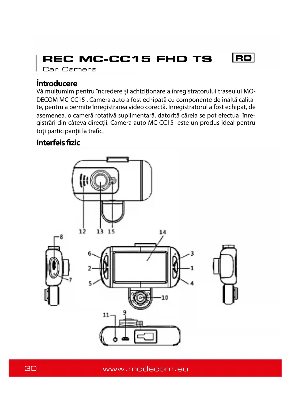 Vă multțumim pentru încredereși achizționare a înregistratorului traseului MODECOM MC-CC15. Camera auto a fostechipata cu componente de inaltă calitate, pentru a permite înregistrarea video corectă. Inregistratorul a fost echipat, de asemenea, o camera rotativă supplementara, datorită cărea se pot efectua înregistrări din câteva direcții. Camera auto MC-CC15 este un produs ideal pentru toti participanții laTraffic.