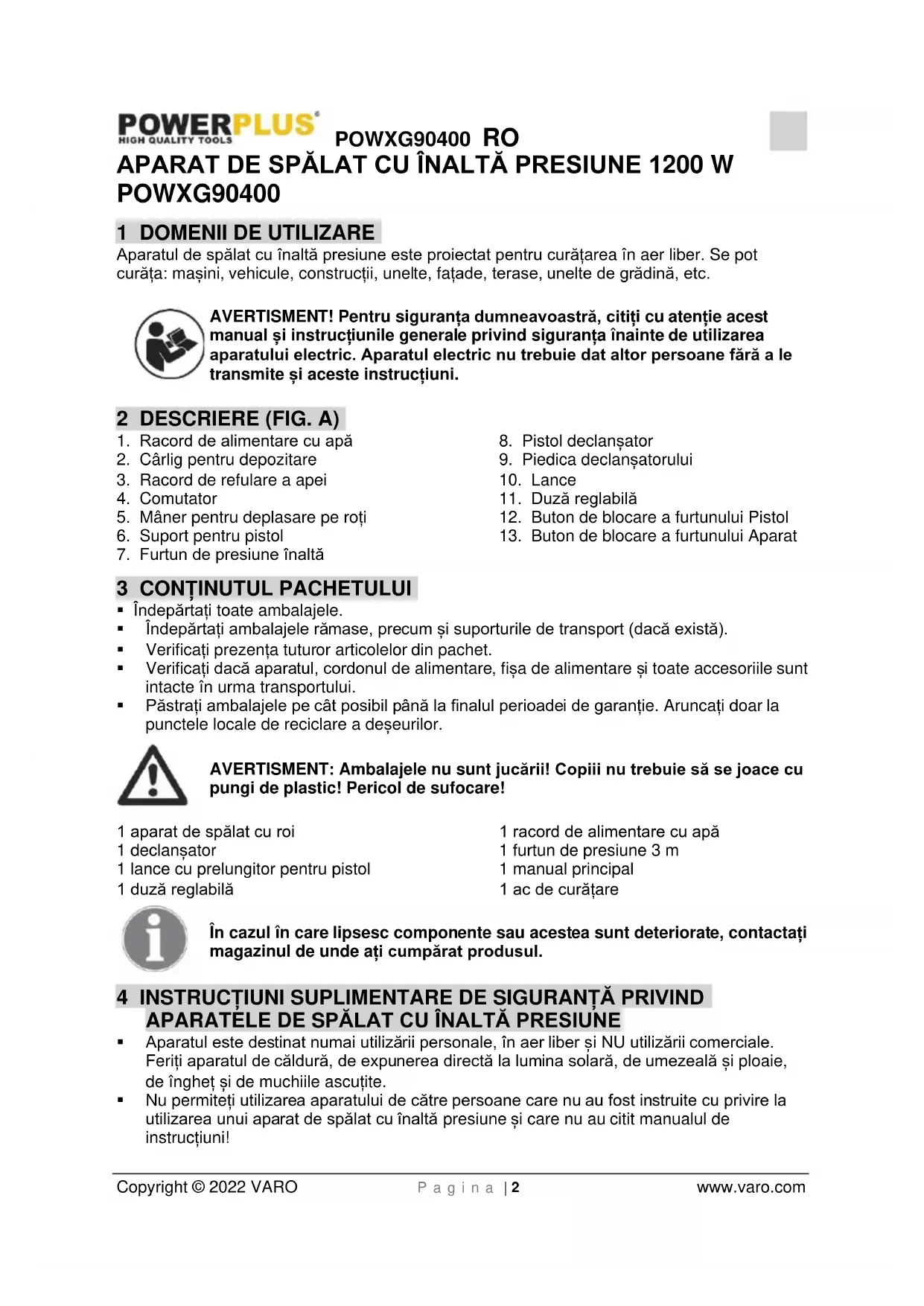 - Nu permiteți utilizarea aparatului de către persoane care nu au fost instruite cu privire la utilizarea unui aparat de spălat cu înaltă presiune și care nu au citit manualul de instrucțiuni!POWXG90400 RO Copyright © 2022 VARO P a g i n a | 3 www.varo.com