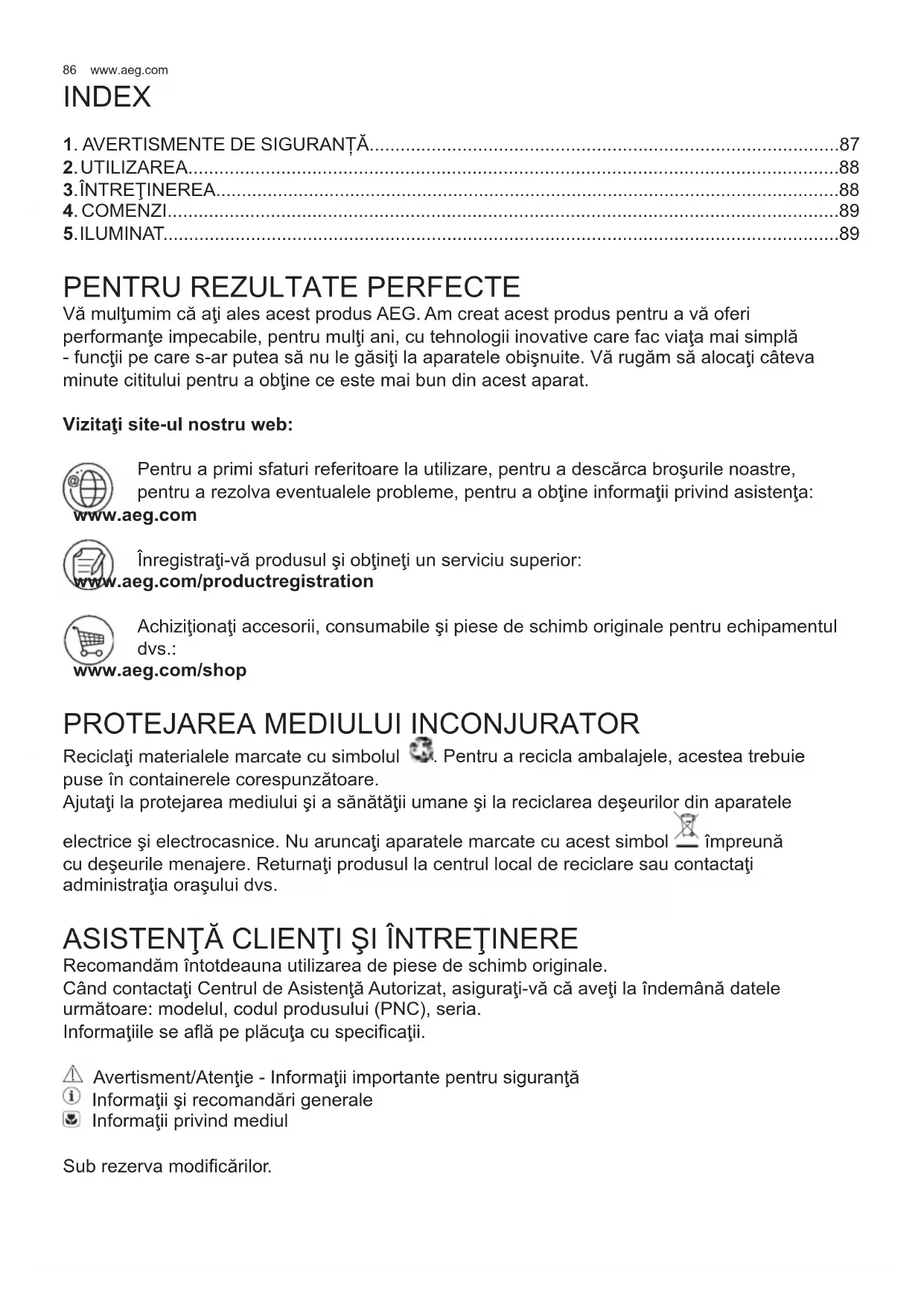 Vĕ mulIJumim cĕ aIJi ales acest produs AEG. Am creat acest produs pentru a vĕ oferi performanIJe impecabile, pentru mulIJi ani, cu tehnologii inovative care fac viaIJa mai simplĕ - funcIJii pe care s-ar putea sĕ nu le gĕsiIJi la aparatele obişnuite. Vĕ rugĕm sĕ alocaIJi câteva minute cititului pentru a obIJine ce este mai bun din acest aparat. Vizitai site-ul nostru web: Pentru a primi sfaturi referitoare la utilizare, pentru a descĕrca broşurile noastre, pentru a rezolva eventualele probleme, pentru a obIJine informaIJii privind asistenIJa: www.aeg.com ÎnregistraIJi-vĕ produsul şi obIJineIJi un serviciu superior: www.aeg.com/productregistration AchiziIJionaIJi accesorii, consumabile şi piese de schimb originale pentru echipamentul dvs.: www.aeg.com/shop
